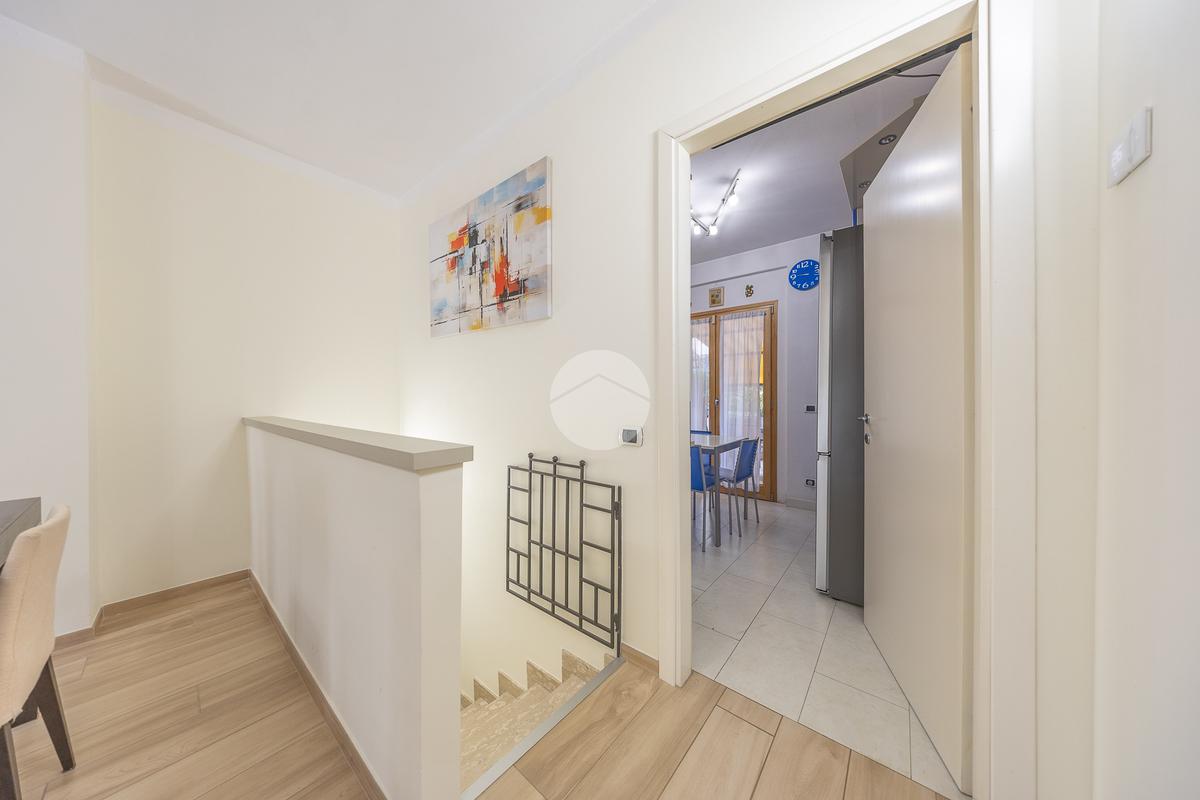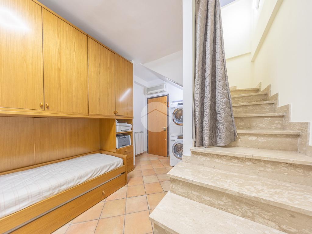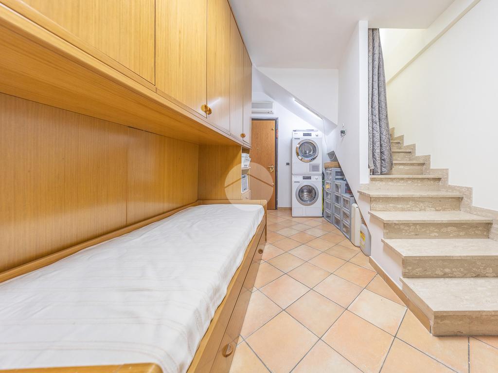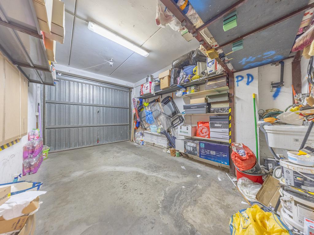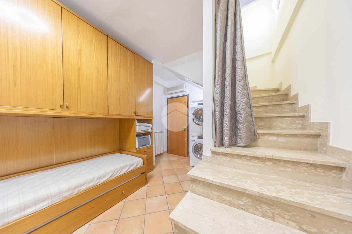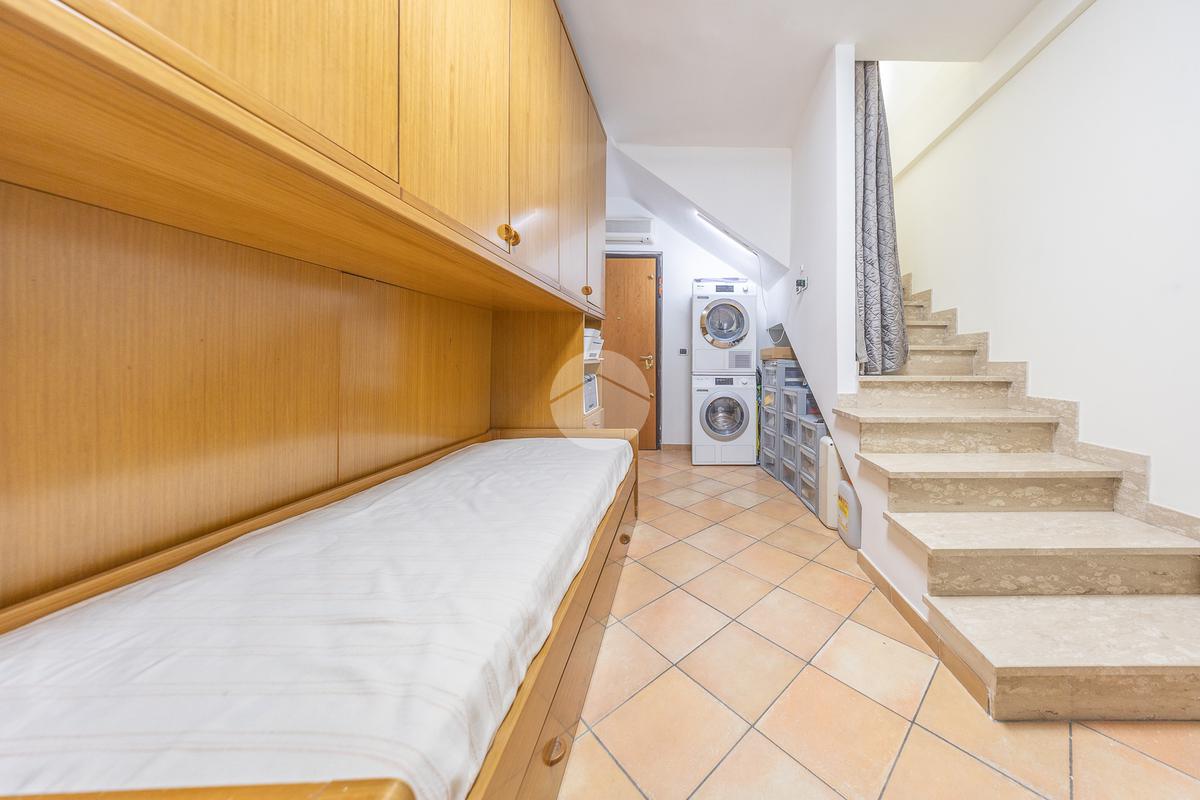 Una raffinata scala conduce al piano inferiore, dove si trova un ambiente finestrato ideale come lavanderia o cameretta, con accesso diretto al box auto soppalcato provvisto di allarme.
