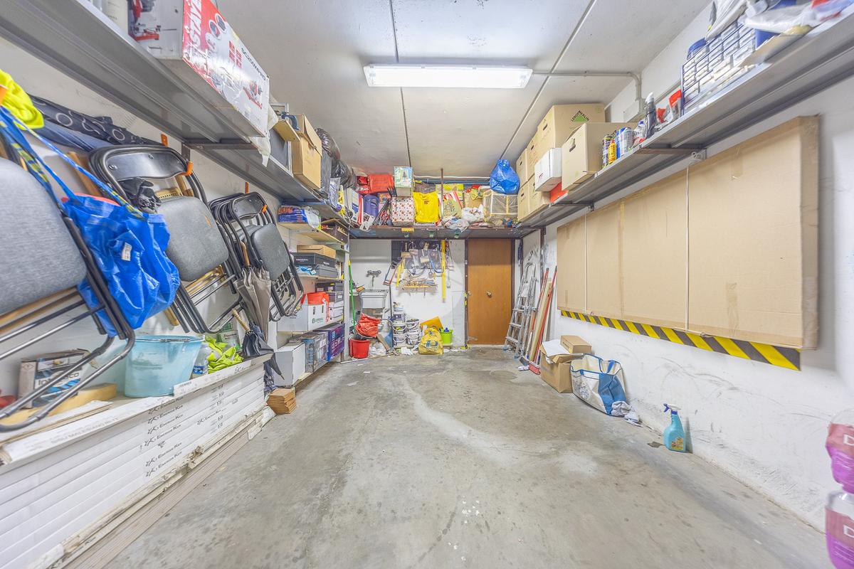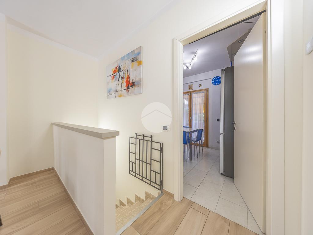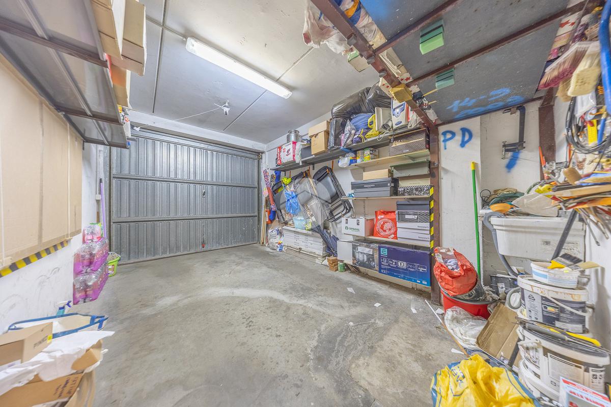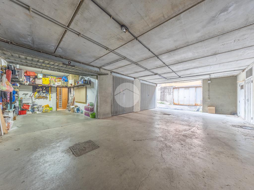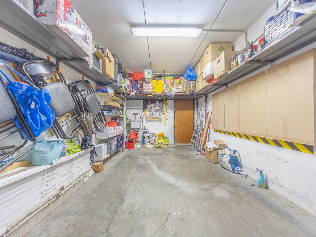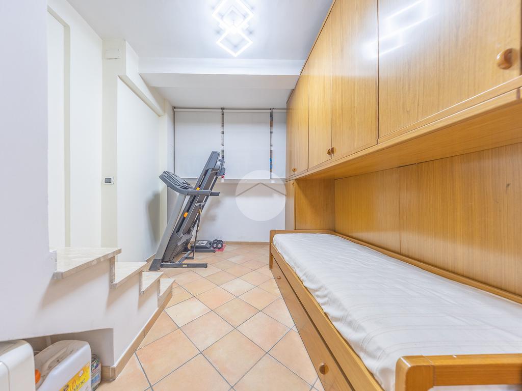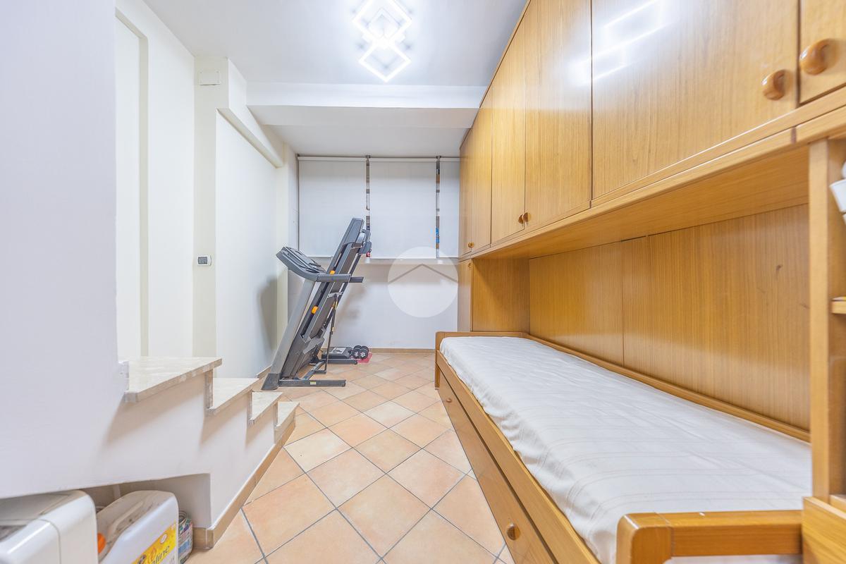 Una raffinata scala conduce al piano inferiore, dove si trova un ambiente finestrato ideale come lavanderia o cameretta, con accesso diretto al box auto soppalcato provvisto di allarme.