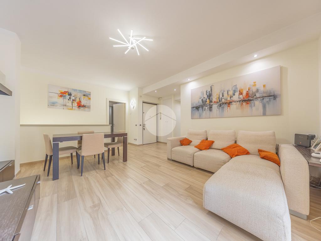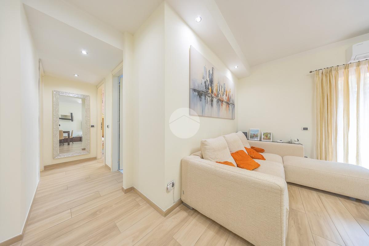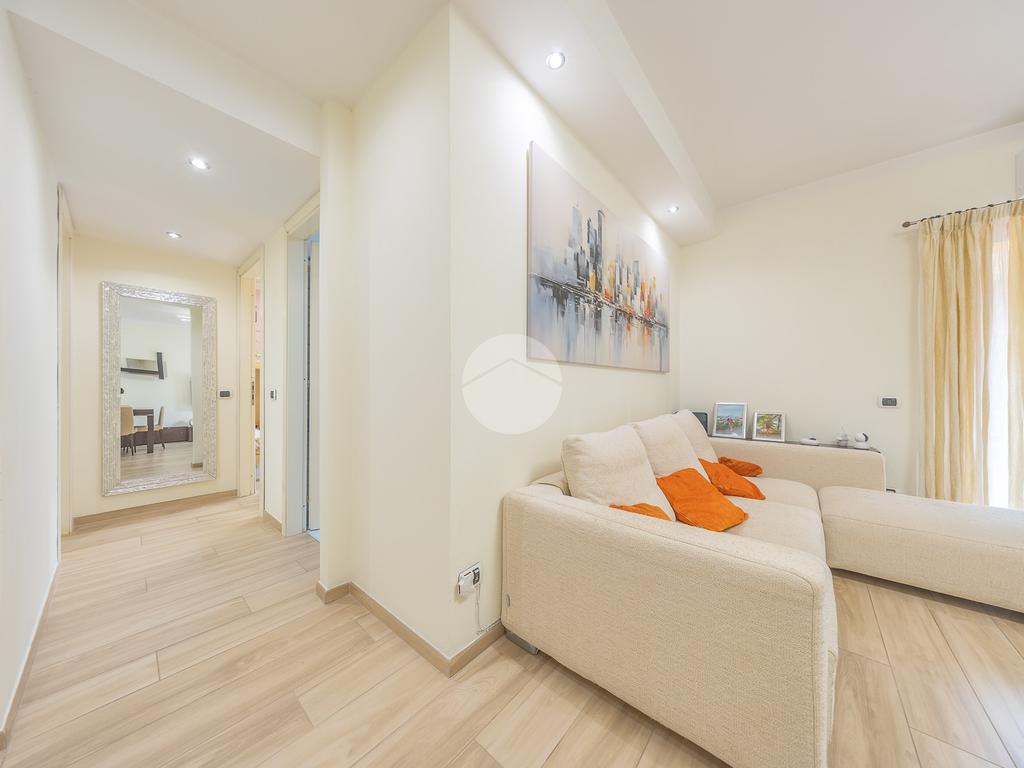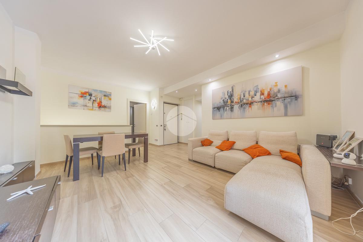 L'ingresso si apre su un ampio e luminoso soggiorno, dai toni moderni e raffinati, caratterizzato da un grès porcellanato presente in tutti gli ambienti.