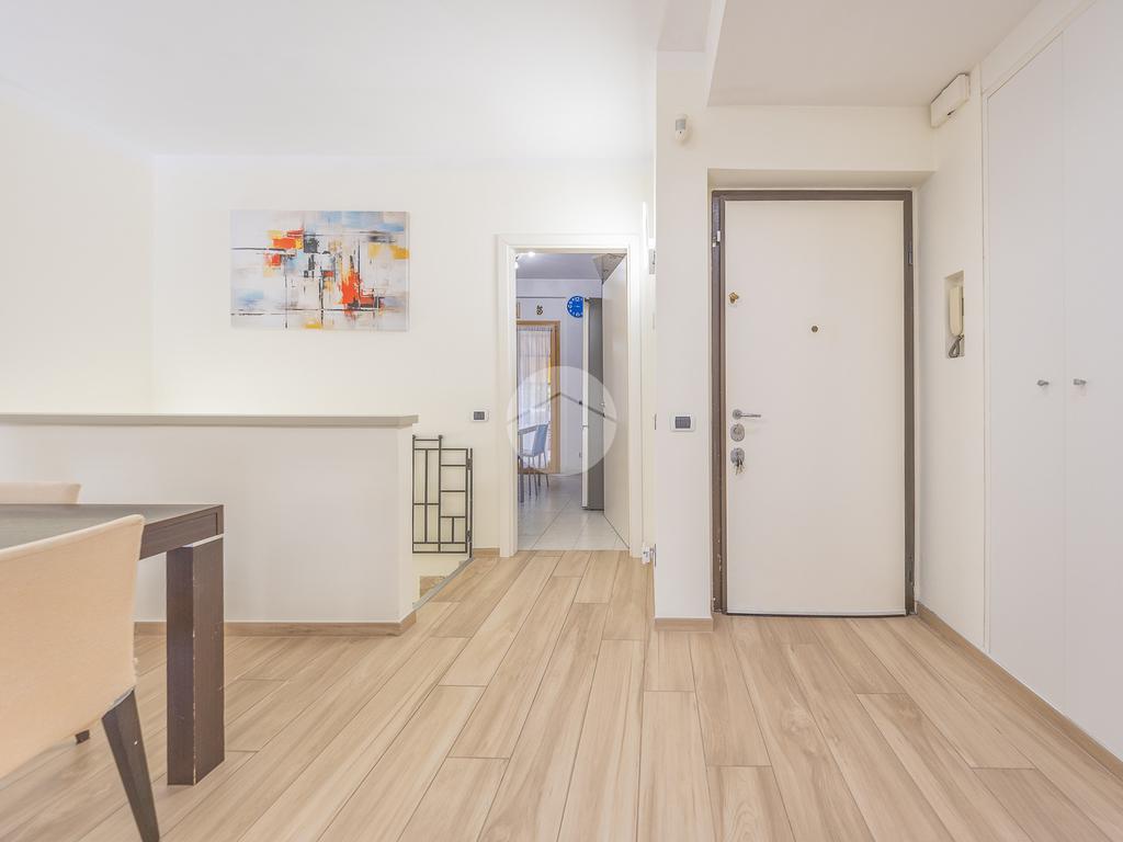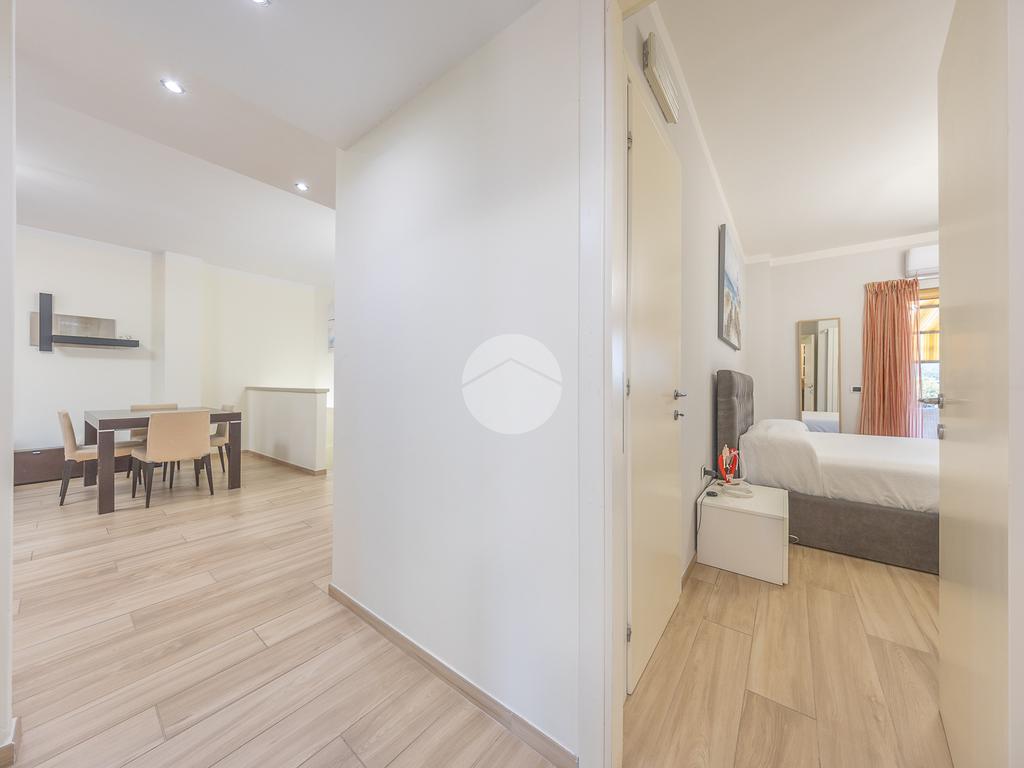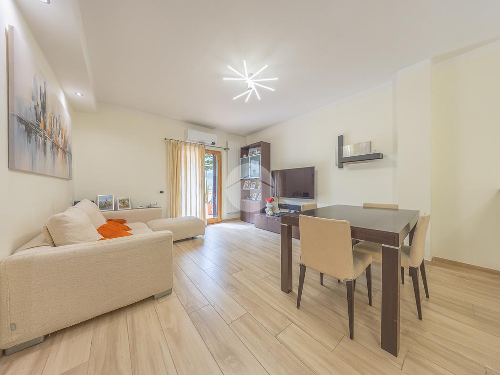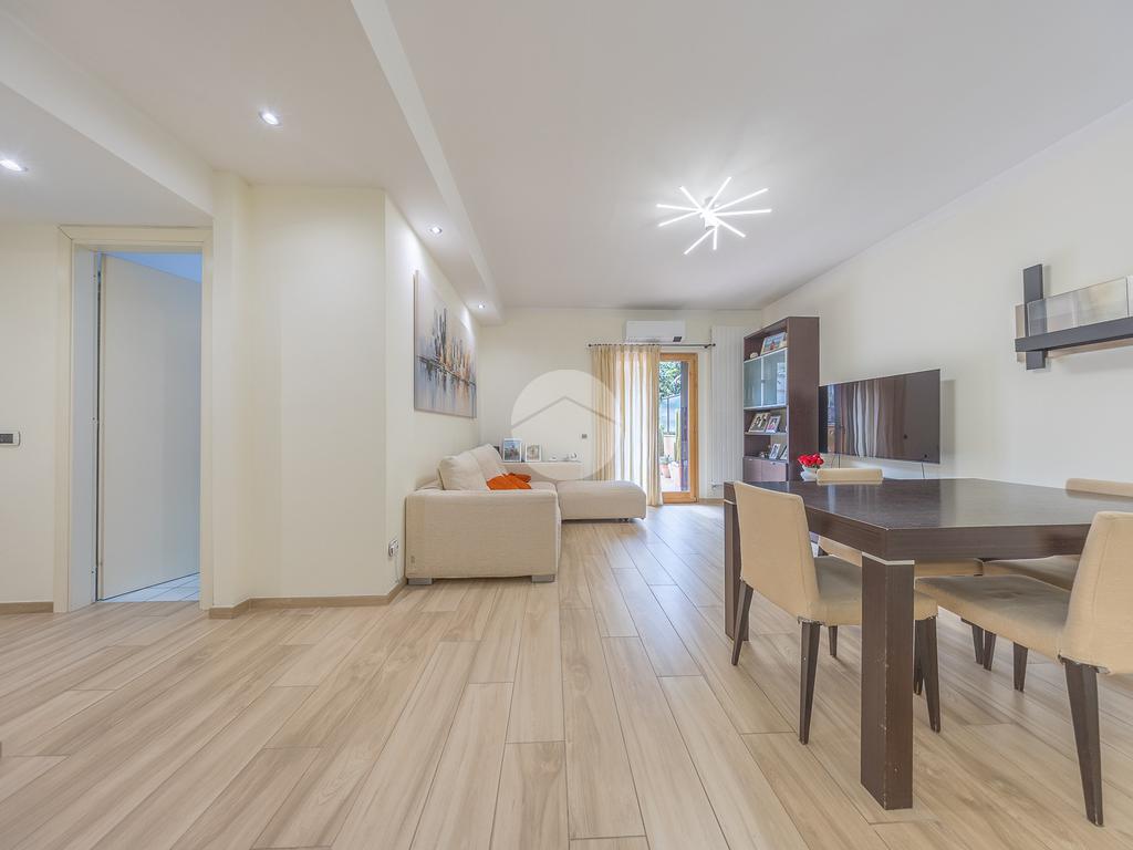 L'ingresso si apre su un ampio e luminoso soggiorno, dai toni moderni e raffinati, caratterizzato da un grès porcellanato presente in tutti gli ambienti.
