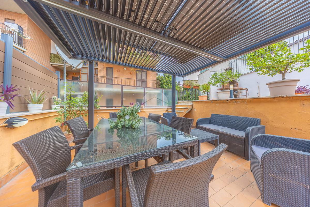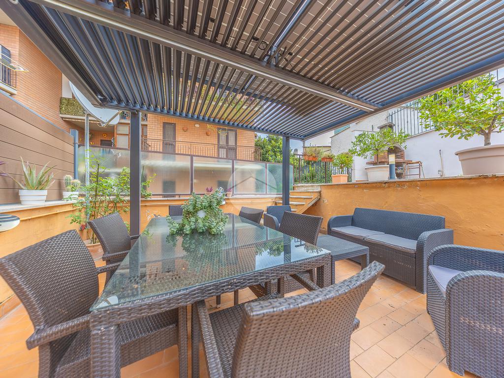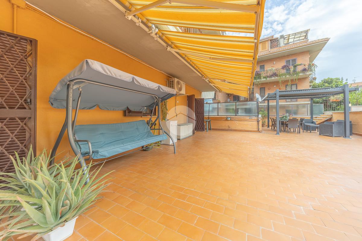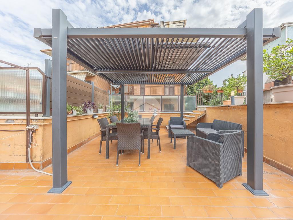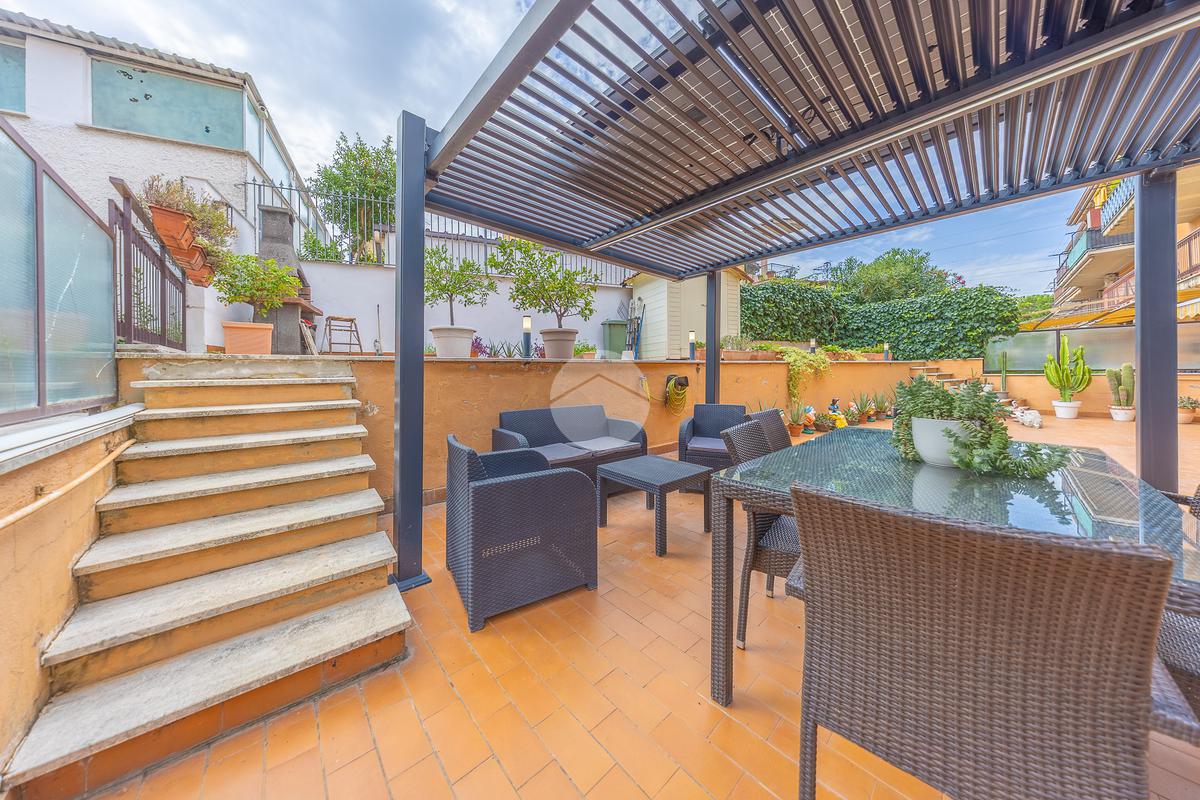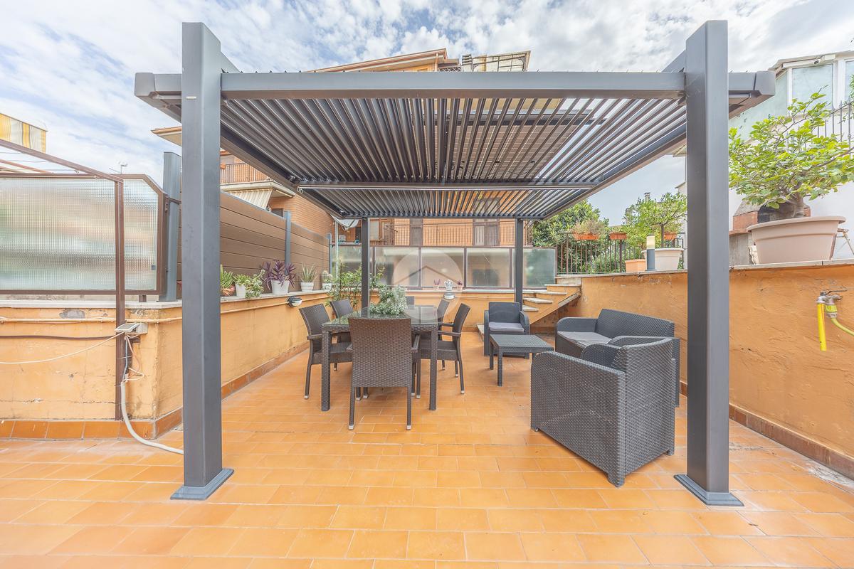 Attraverso una porta finestra si accede direttamente al terrazzo di 130mq, dove sono disposti un gazebo bioclimatico con impianto fotovoltaico di 1 KW, ideale per momenti di relax all'aperto, un gabbiotto per riporre i propri attrezzi, barbecue, e tende da sole. Adiacente alla zona giorno si trova una spaziosa cucina abitabile completa di un secondo terrazzo arricchito da vasi di rattan, tende da sole, zanzariere e videocamere di sorveglianza.