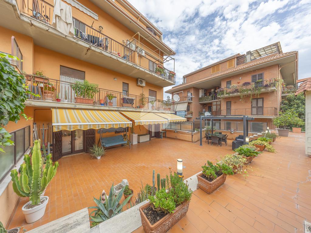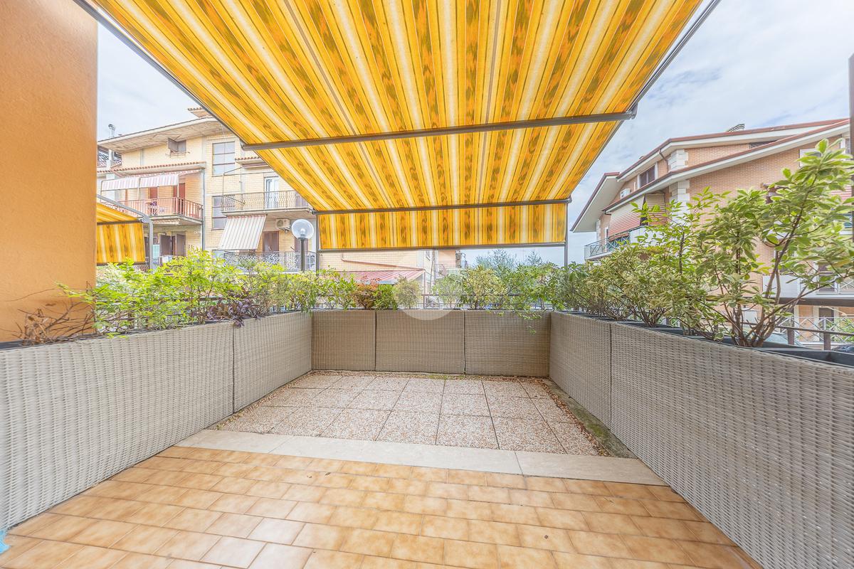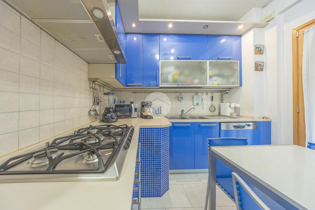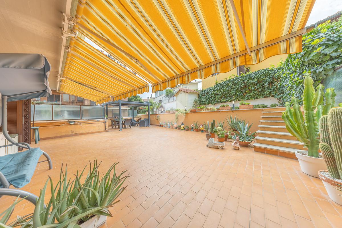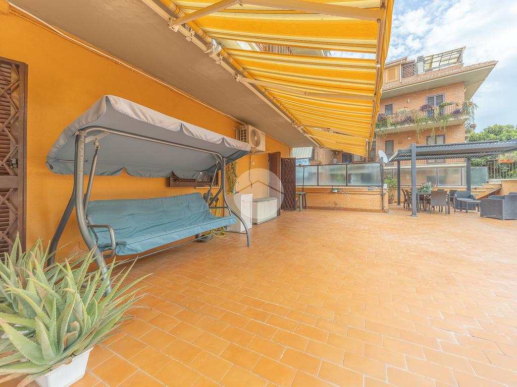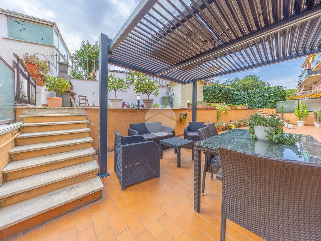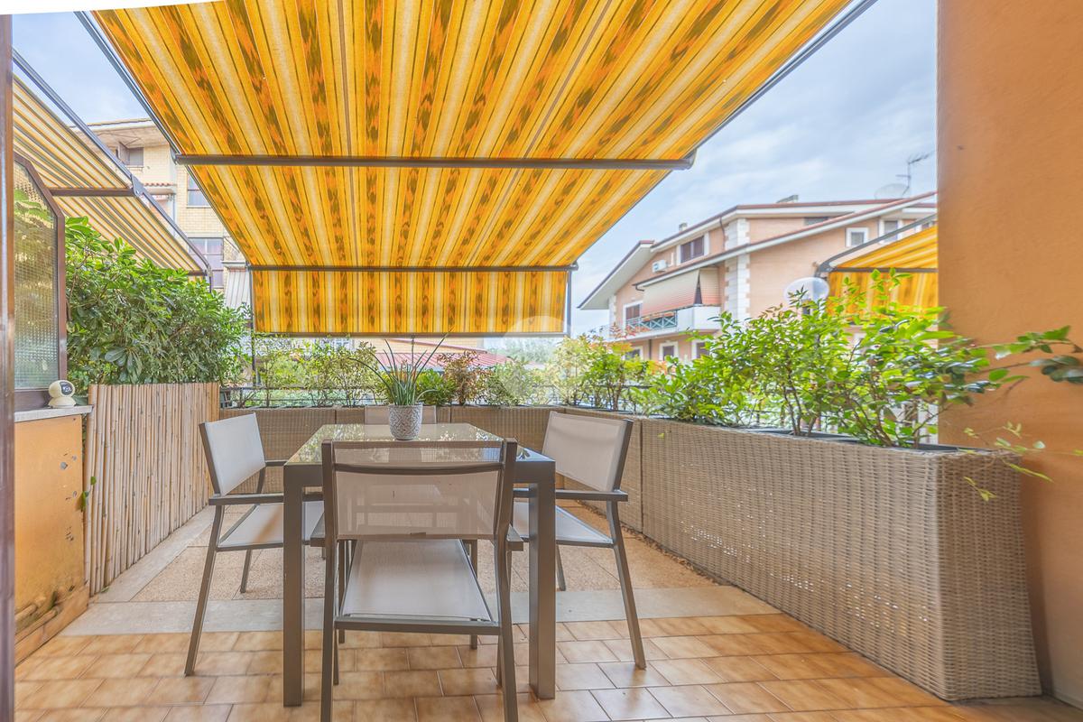Attraverso una porta finestra si accede direttamente al terrazzo di 130mq, dove sono disposti un gazebo bioclimatico con impianto fotovoltaico di 1 KW, ideale per momenti di relax all'aperto, un gabbiotto per riporre i propri attrezzi, barbecue, e tende da sole. Adiacente alla zona giorno si trova una spaziosa cucina abitabile completa di un secondo terrazzo arricchito da vasi di rattan, tende da sole, zanzariere e videocamere di sorveglianza.
