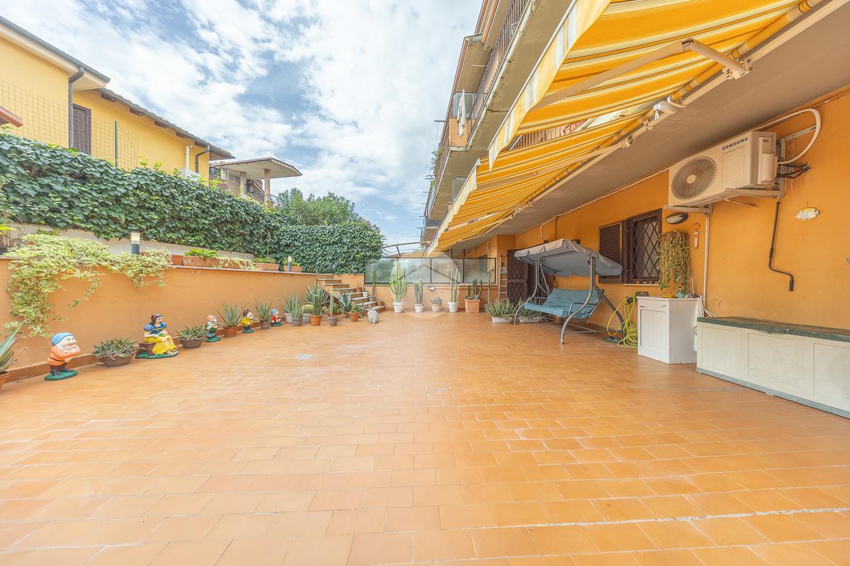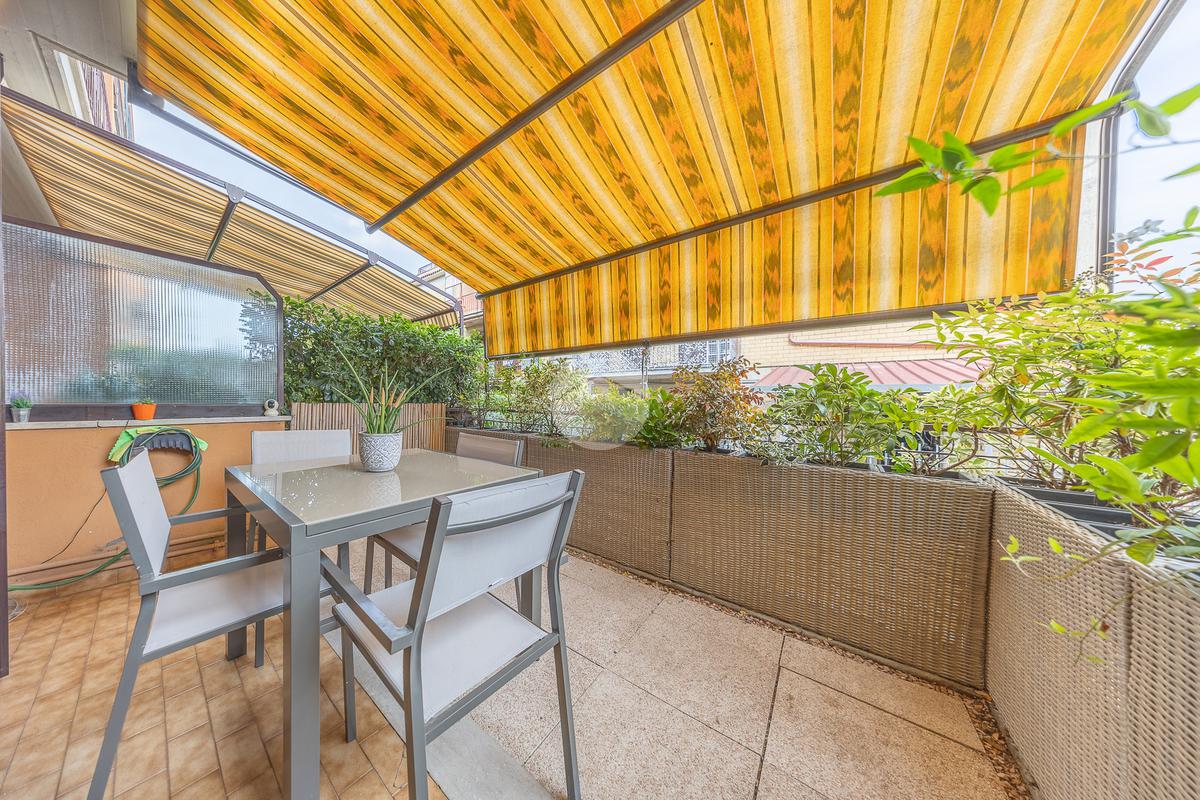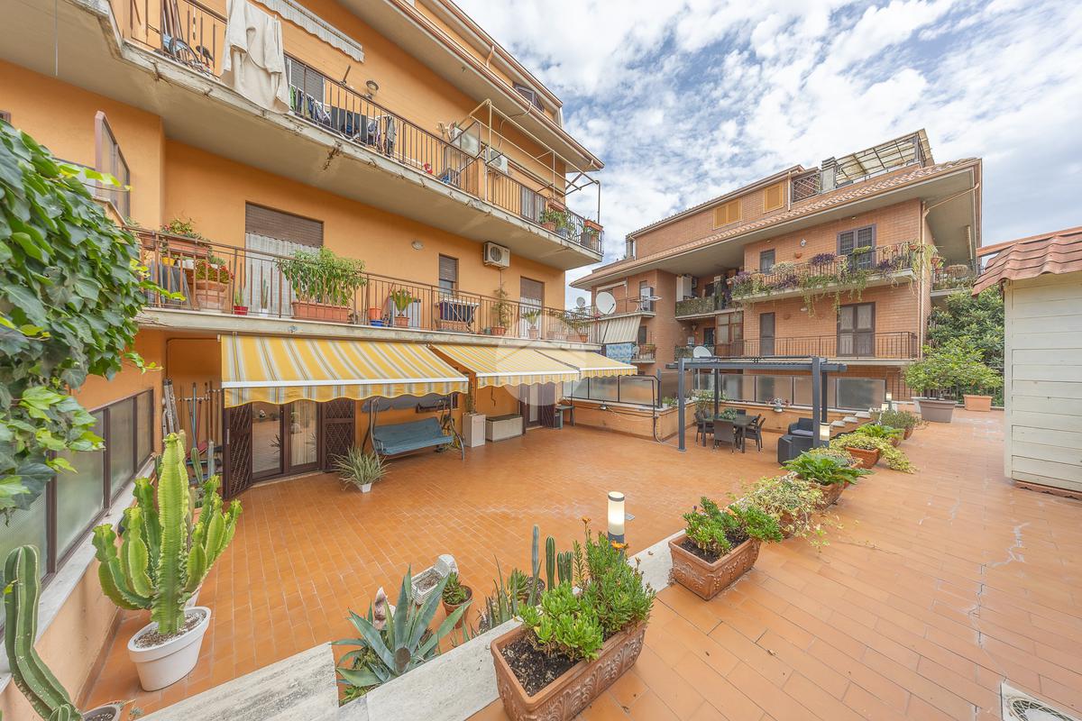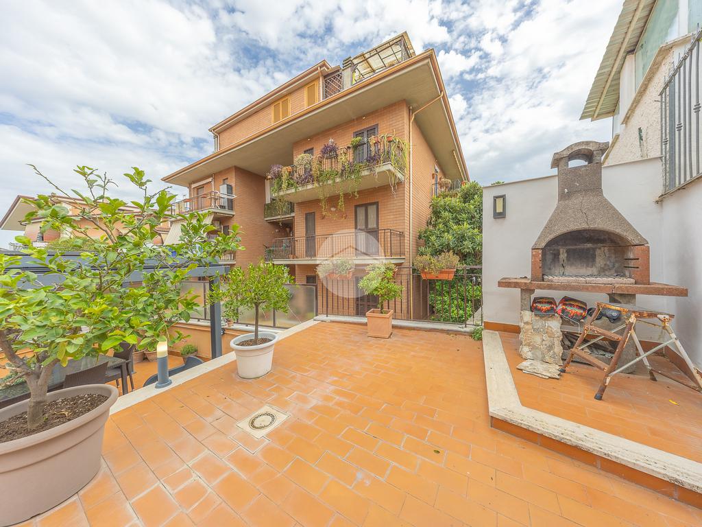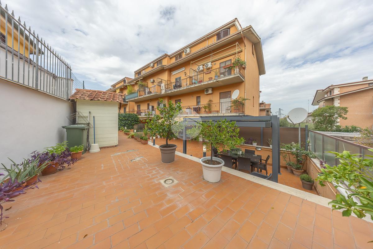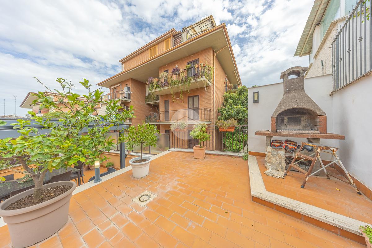 Attraverso una porta finestra si accede direttamente al terrazzo di 130mq, dove sono disposti un gazebo bioclimatico con impianto fotovoltaico di 1 KW, ideale per momenti di relax all'aperto, un gabbiotto per riporre i propri attrezzi, barbecue, e tende da sole. Adiacente alla zona giorno si trova una spaziosa cucina abitabile completa di un secondo terrazzo arricchito da vasi di rattan, tende da sole, zanzariere e videocamere di sorveglianza.