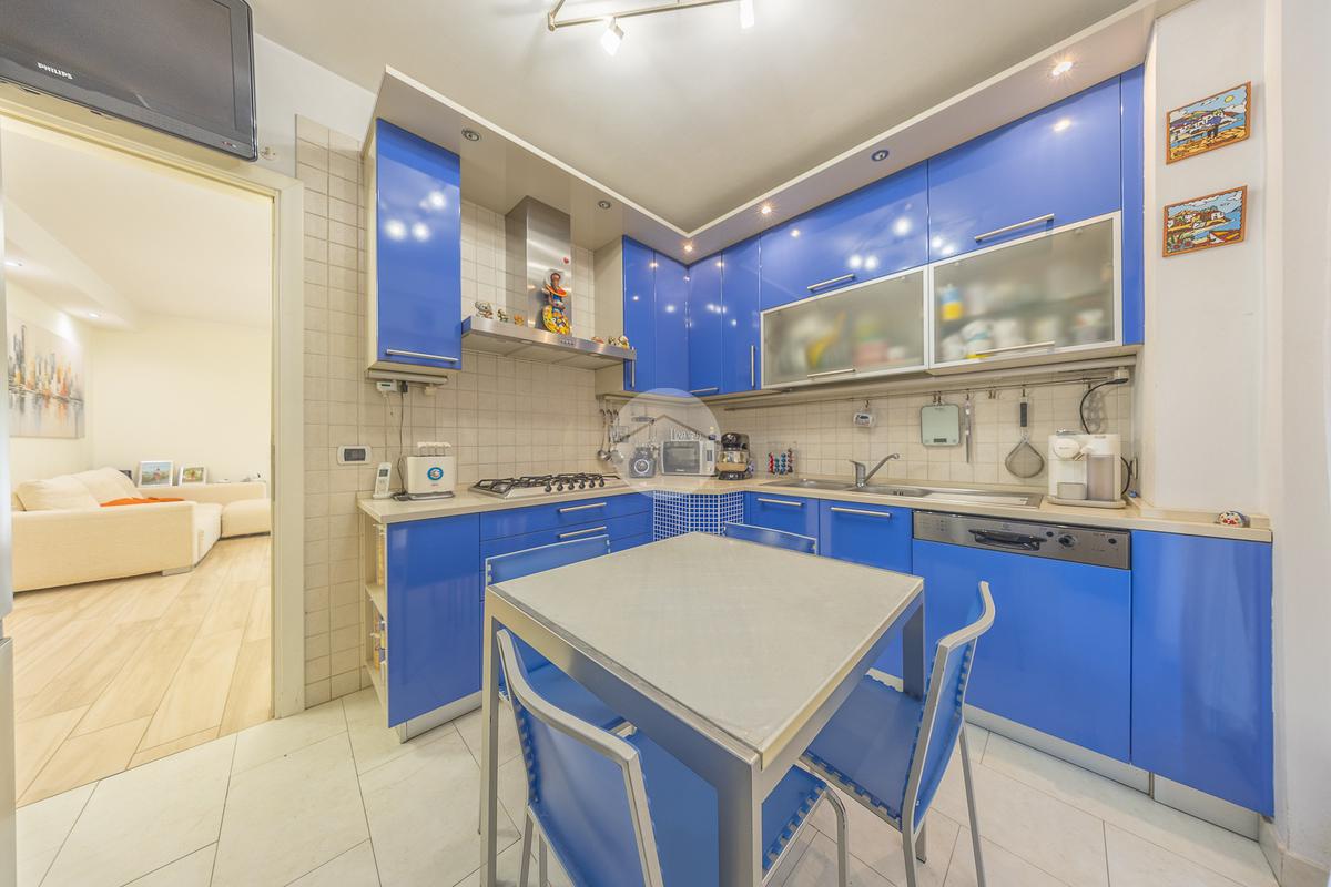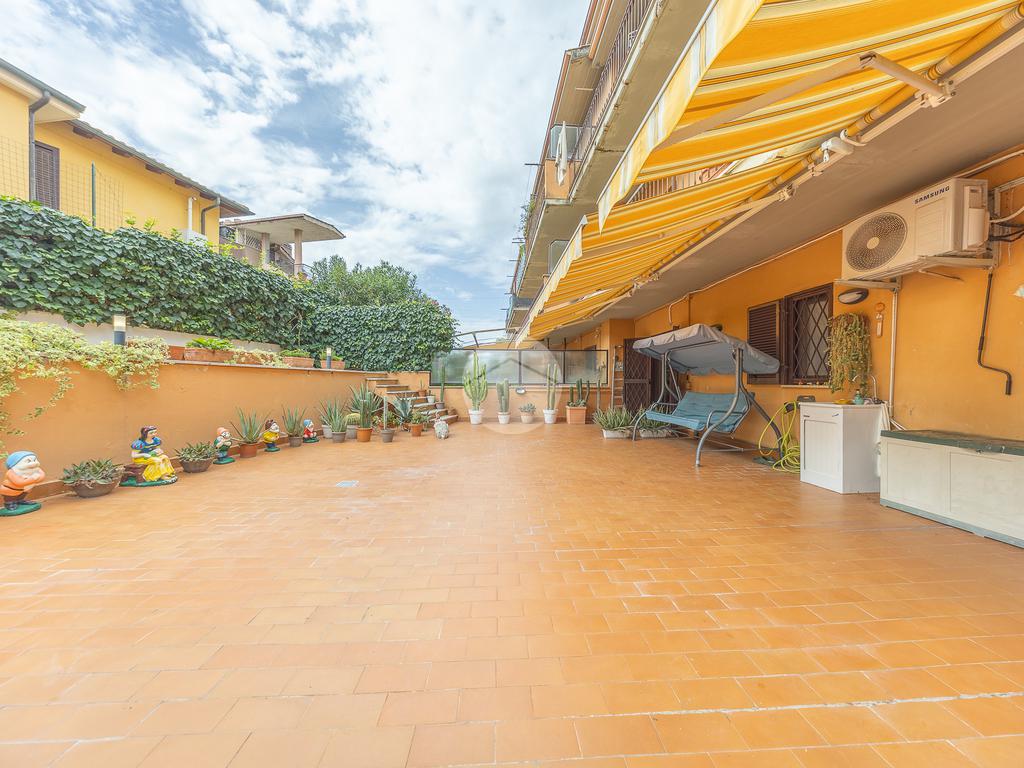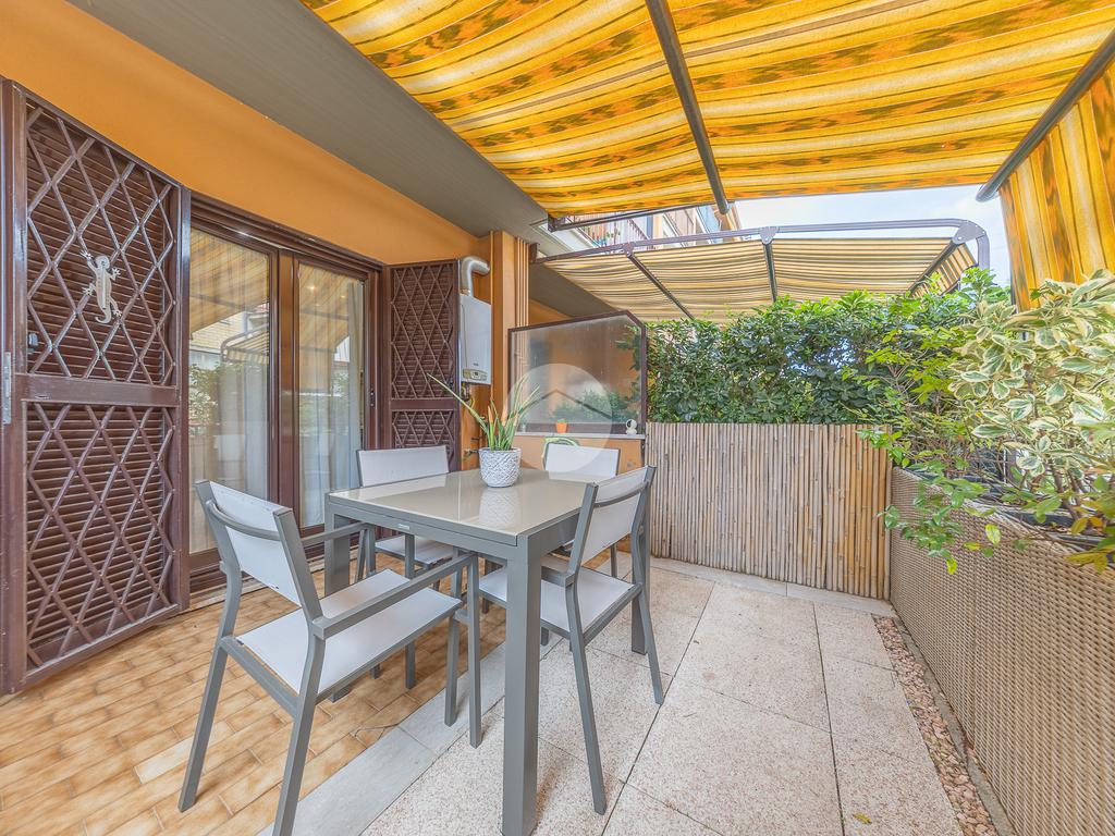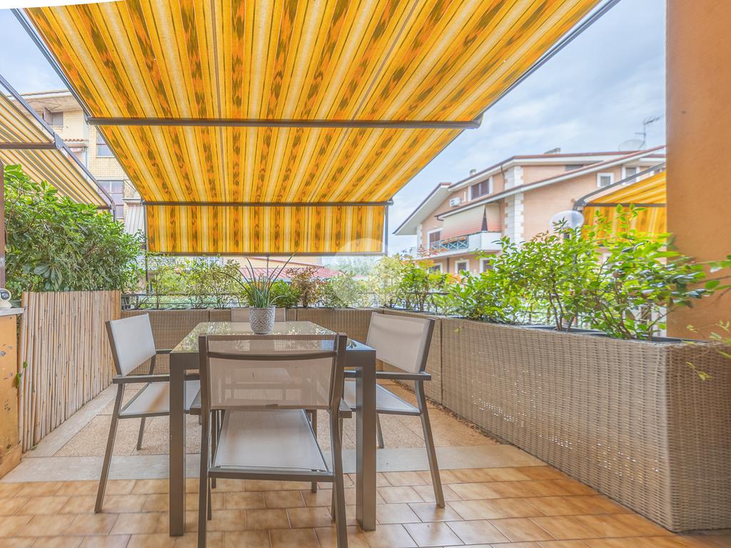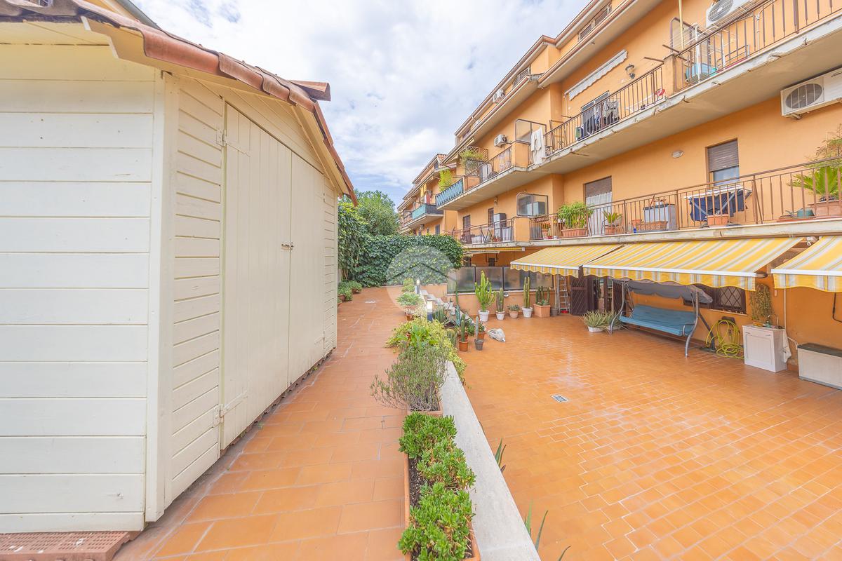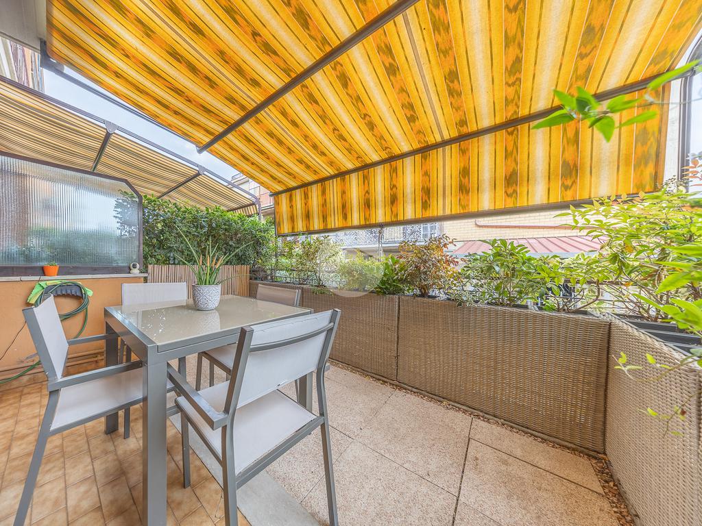 Attraverso una porta finestra si accede direttamente al terrazzo di 130mq, dove sono disposti un gazebo bioclimatico con impianto fotovoltaico di 1 KW, ideale per momenti di relax all'aperto, un gabbiotto per riporre i propri attrezzi, barbecue, e tende da sole. Adiacente alla zona giorno si trova una spaziosa cucina abitabile completa di un secondo terrazzo arricchito da vasi di rattan, tende da sole, zanzariere e videocamere di sorveglianza.