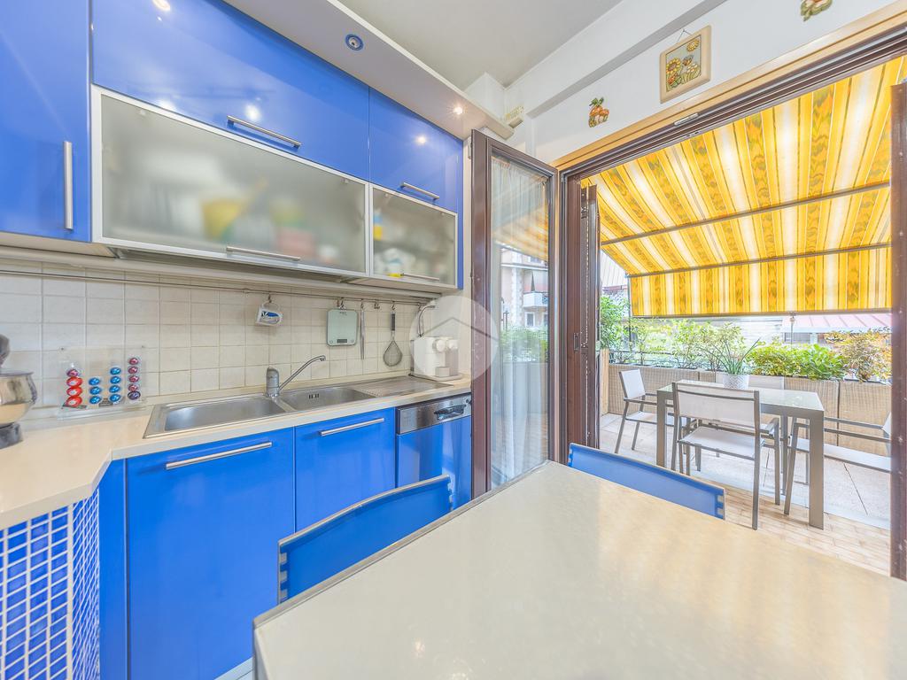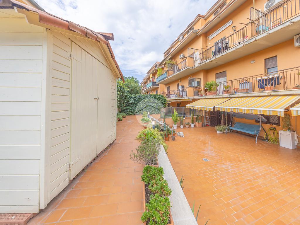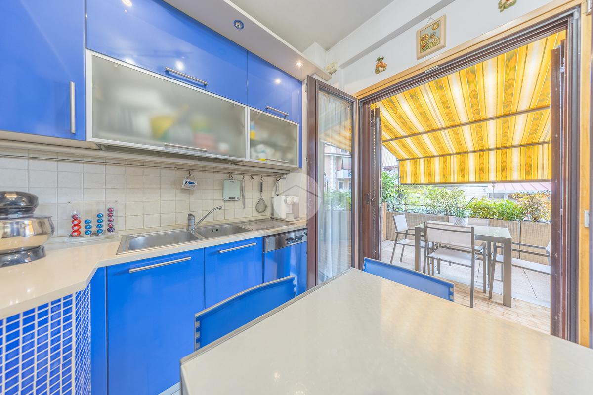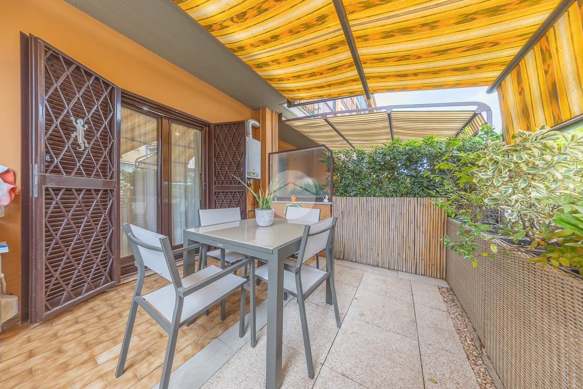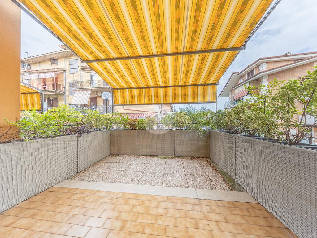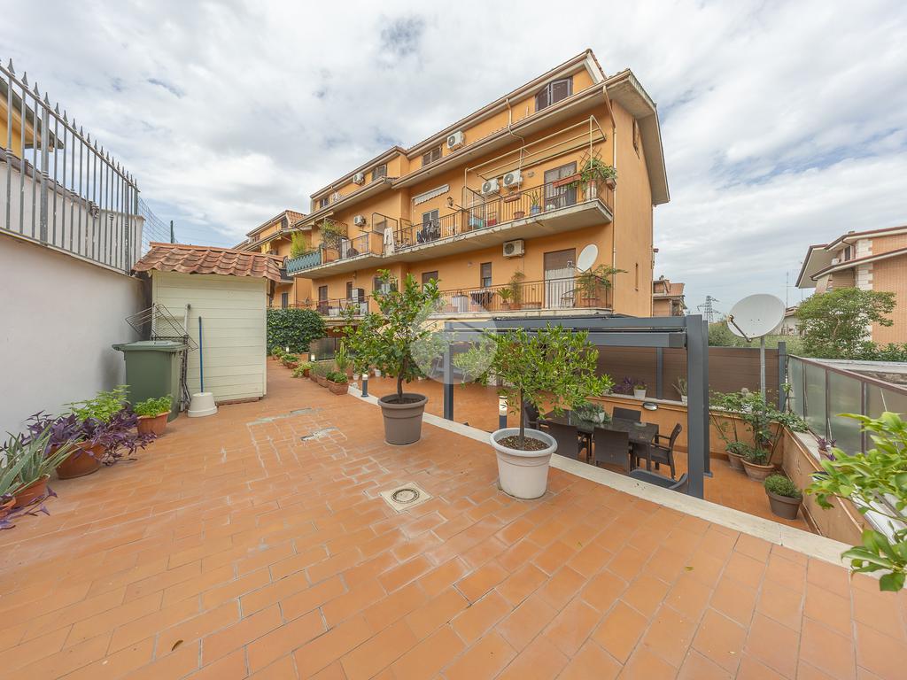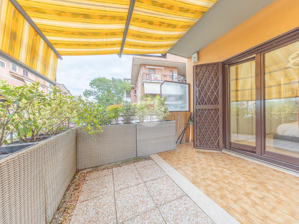 Attraverso una porta finestra si accede direttamente al terrazzo di 130mq, dove sono disposti un gazebo bioclimatico con impianto fotovoltaico di 1 KW, ideale per momenti di relax all'aperto, un gabbiotto per riporre i propri attrezzi, barbecue, e tende da sole. Adiacente alla zona giorno si trova una spaziosa cucina abitabile completa di un secondo terrazzo arricchito da vasi di rattan, tende da sole, zanzariere e videocamere di sorveglianza.