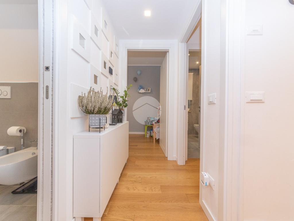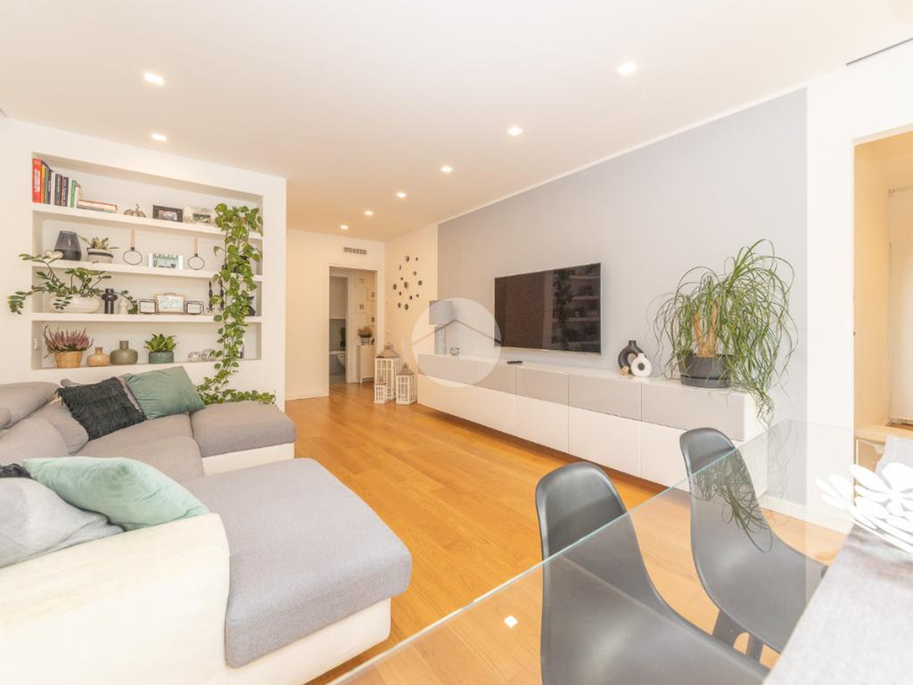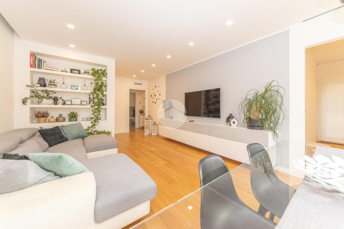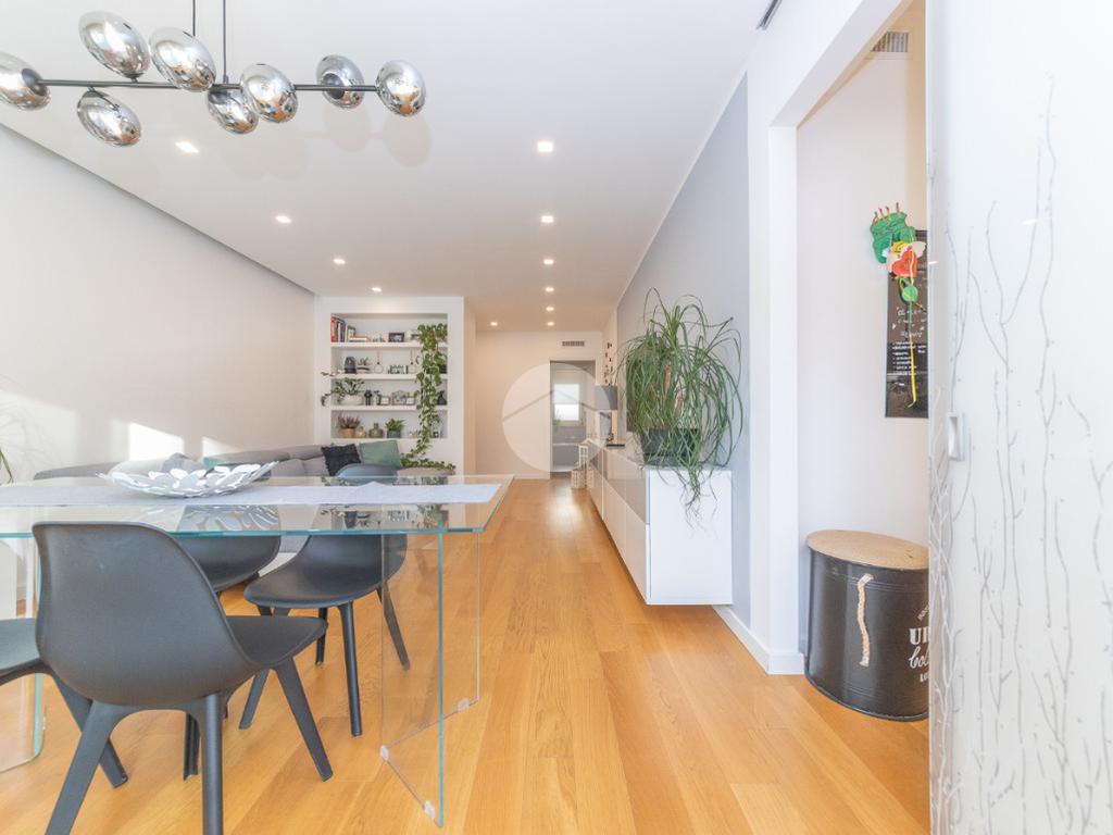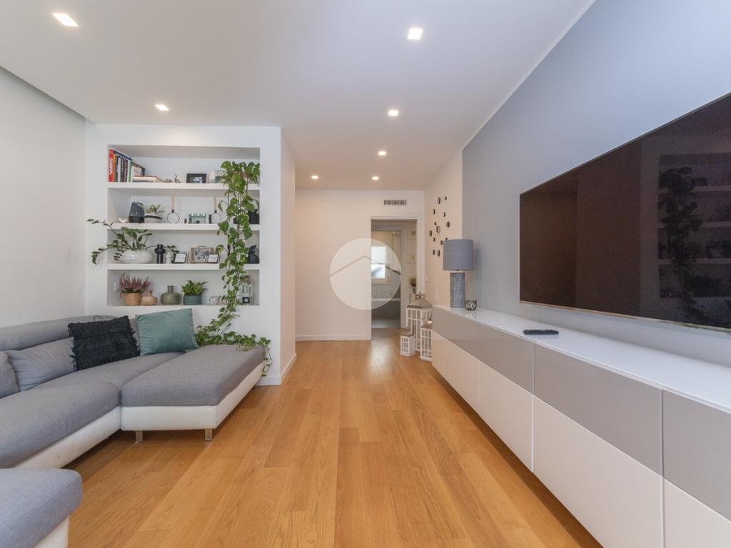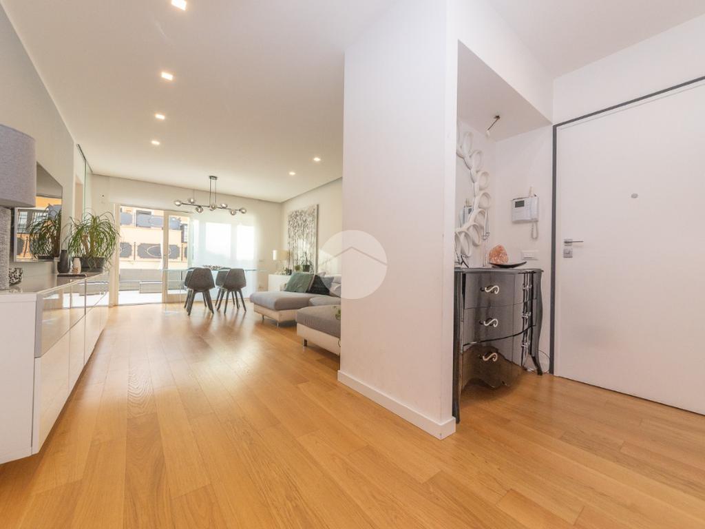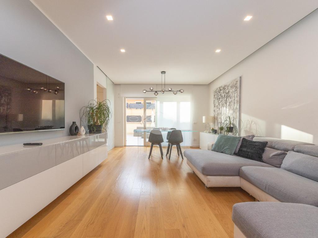 L'ingresso si apre su un ampio e luminoso soggiorno dai toni moderni e raffinati, caratterizzato da un parquet rovere (Listone Giordano) presente in tutti gli ambienti, ad eccezione dei bagni, completamente rivestiti in gres porcellanato.