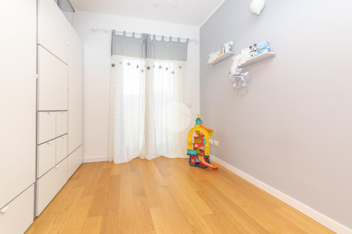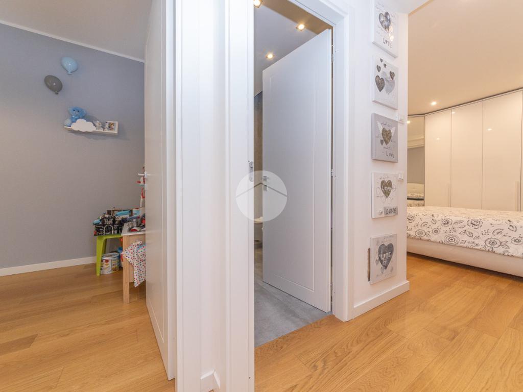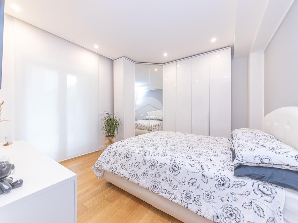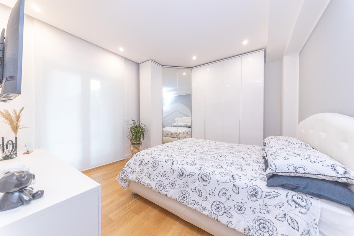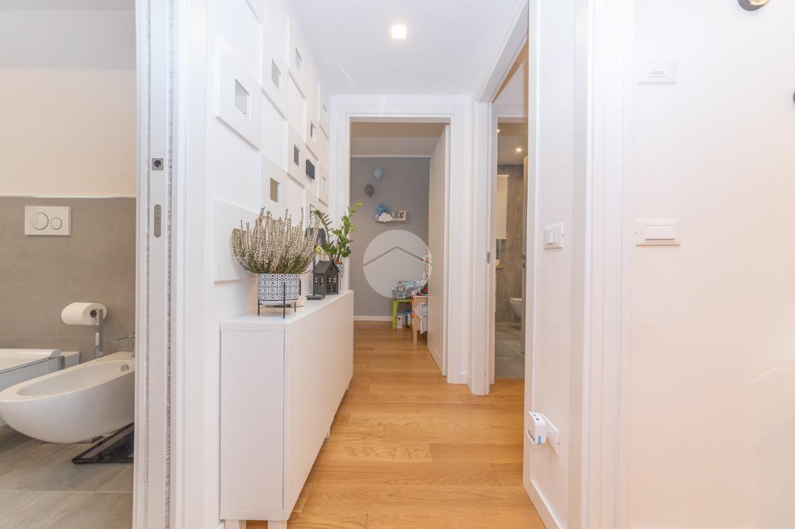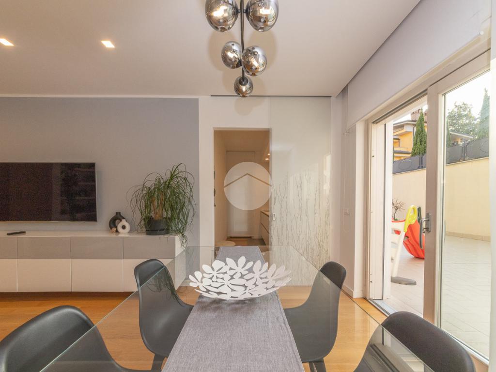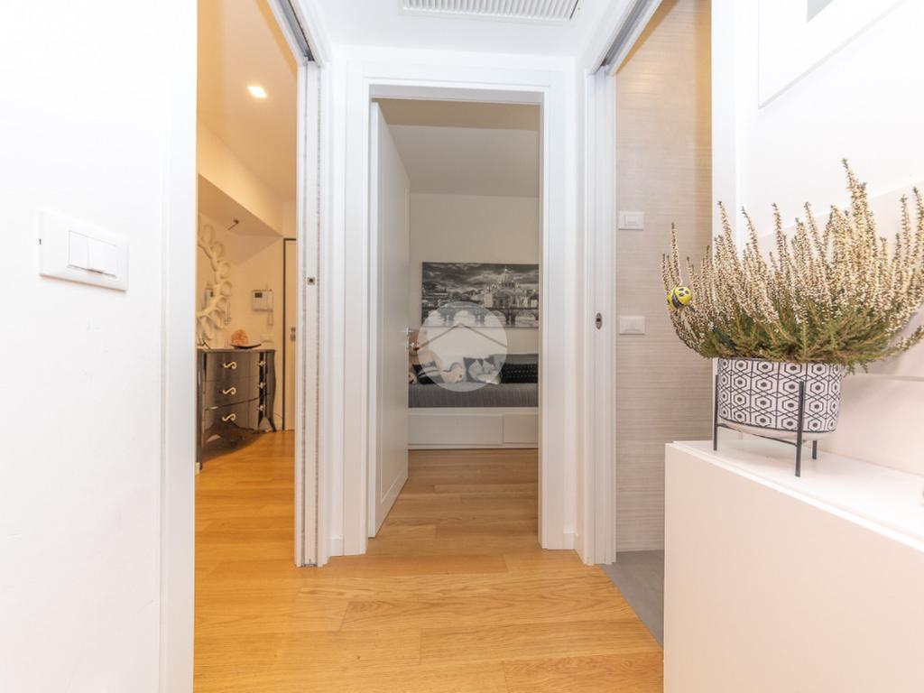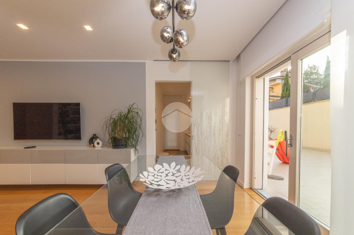 L'ingresso si apre su un ampio e luminoso soggiorno dai toni moderni e raffinati, caratterizzato da un parquet rovere (Listone Giordano) presente in tutti gli ambienti, ad eccezione dei bagni, completamente rivestiti in gres porcellanato.