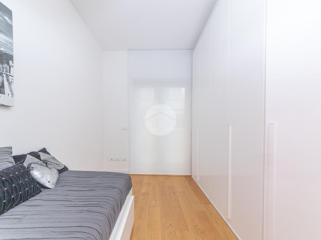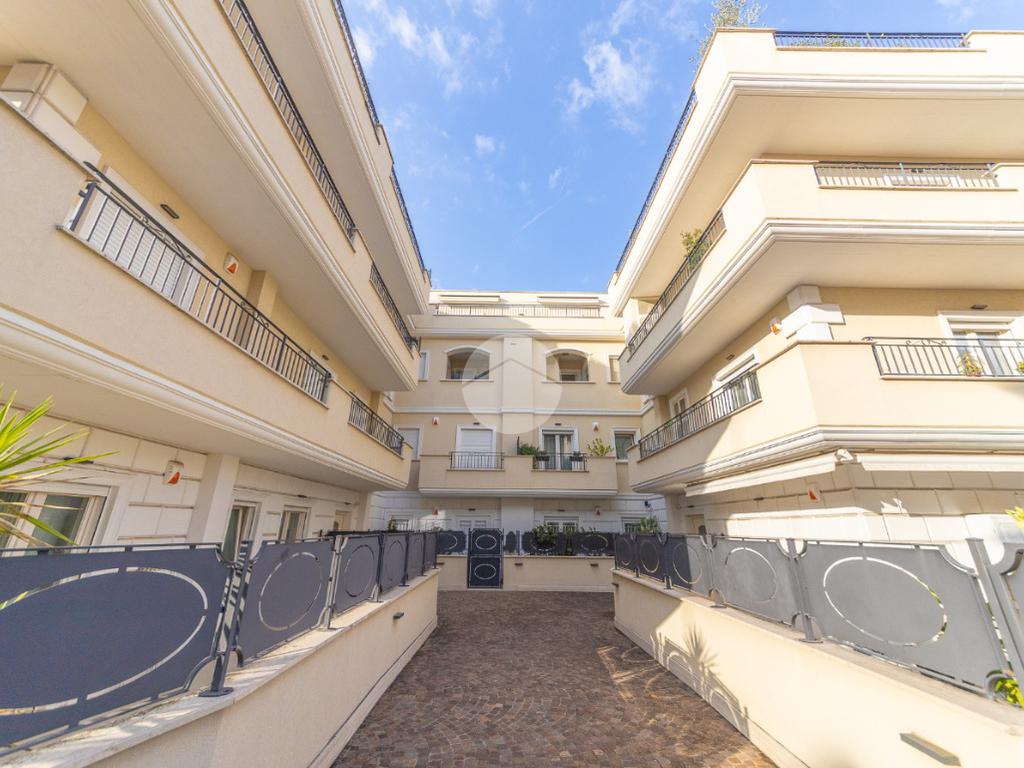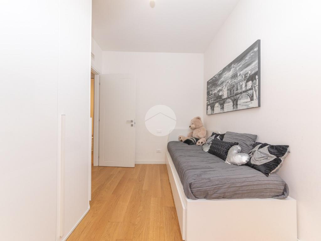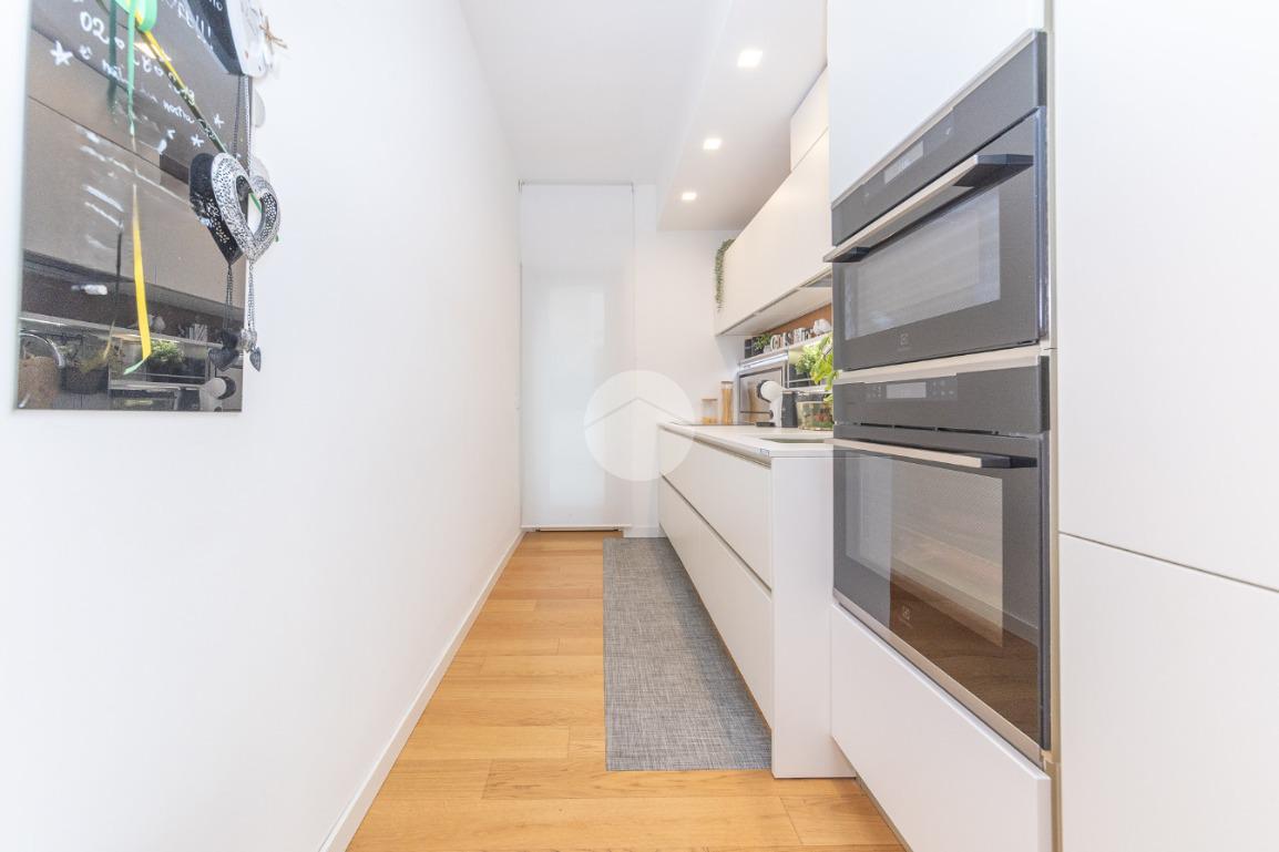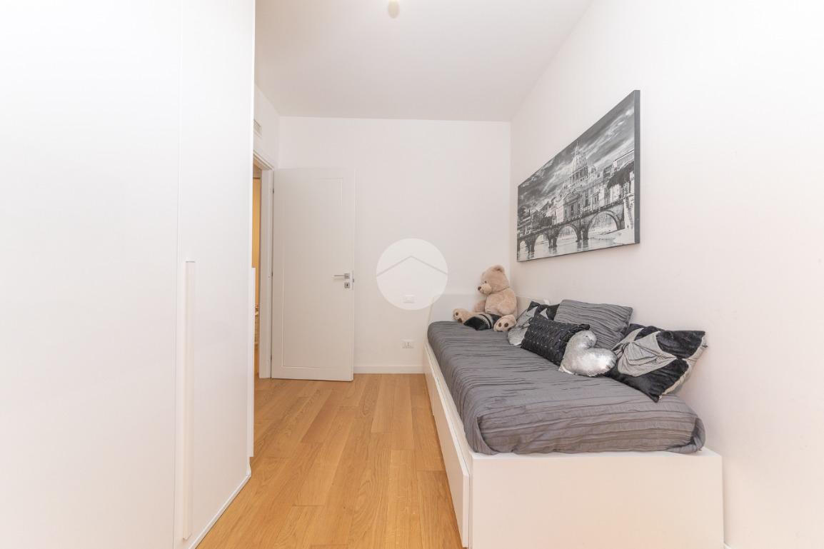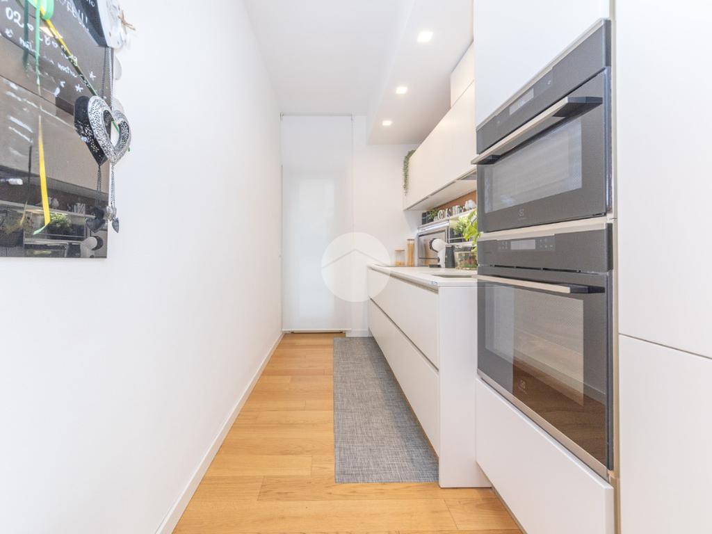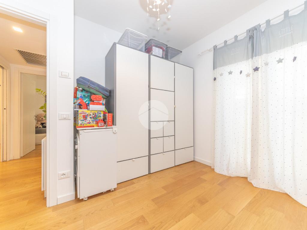 L'ingresso si apre su un ampio e luminoso soggiorno dai toni moderni e raffinati, caratterizzato da un parquet rovere (Listone Giordano) presente in tutti gli ambienti, ad eccezione dei bagni, completamente rivestiti in gres porcellanato.