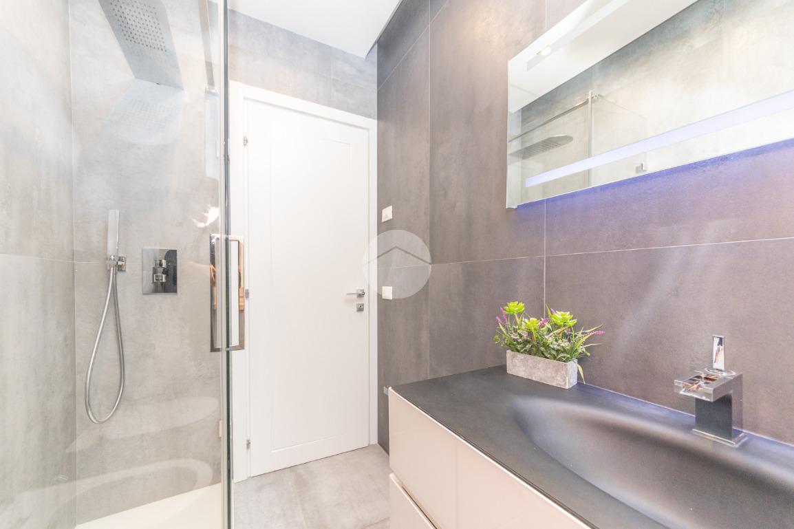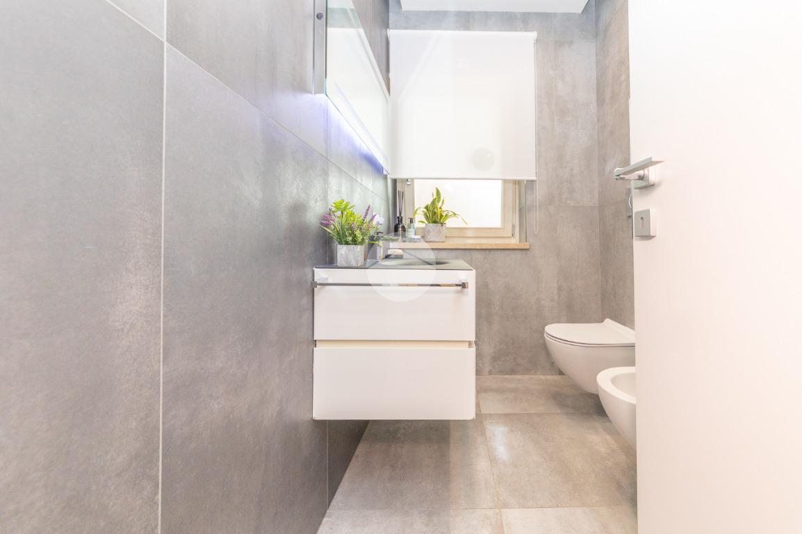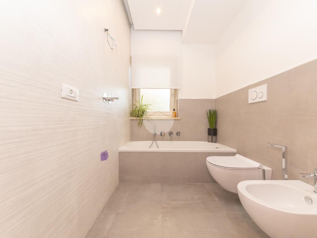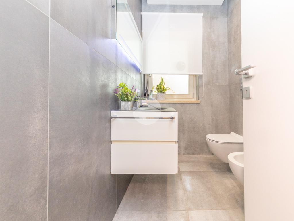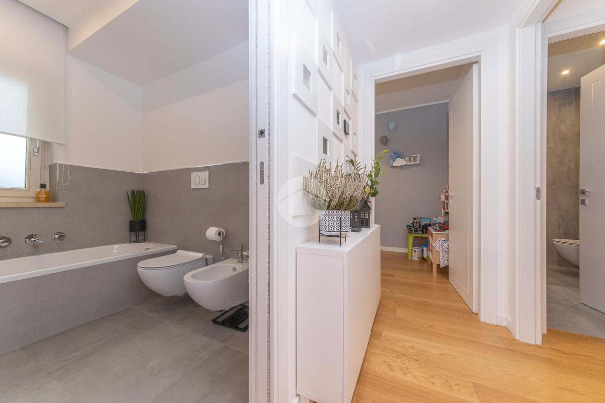 Un disimpegno, divide la zona giorno dalla zona notte, composta da tre camere da letto matrimoniali, ciascuna con accesso diretto al terrazzo, accessoriato di locale tecnico con predisposizione per lavatrice esterna e boiler dell’acqua da 200L e due servizi finestrati di cui uno en suite completo di box doccia in cristallo e rubinetteria GESSI, l’altro dotato di vasca (Villeroy & Boch) , sanitari Catalano e rubinetteria Bellosta. Le porte interne Flessya in legno lavorato impreziosiscono ulteriormente l’immobile.