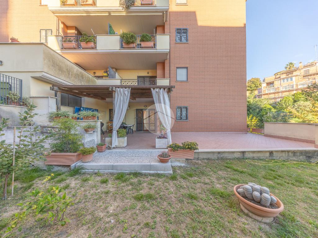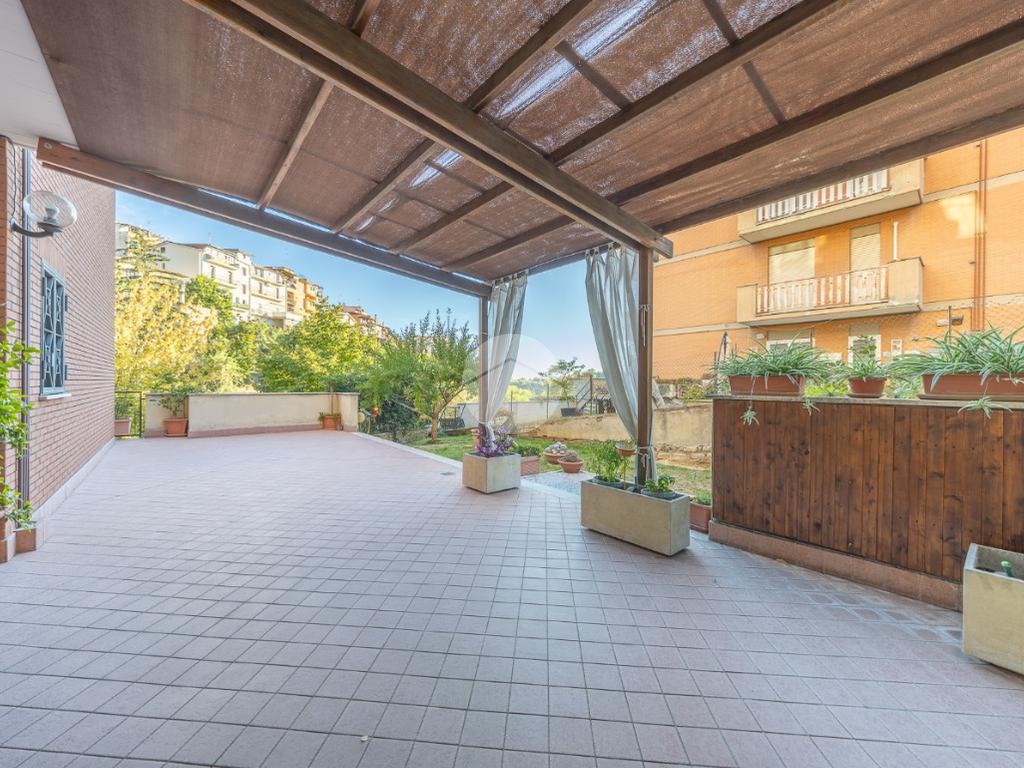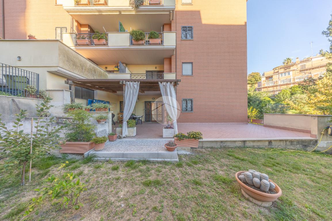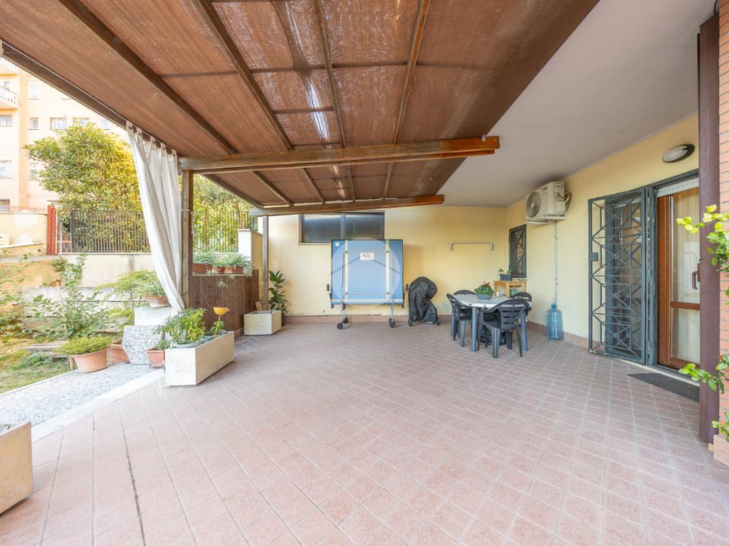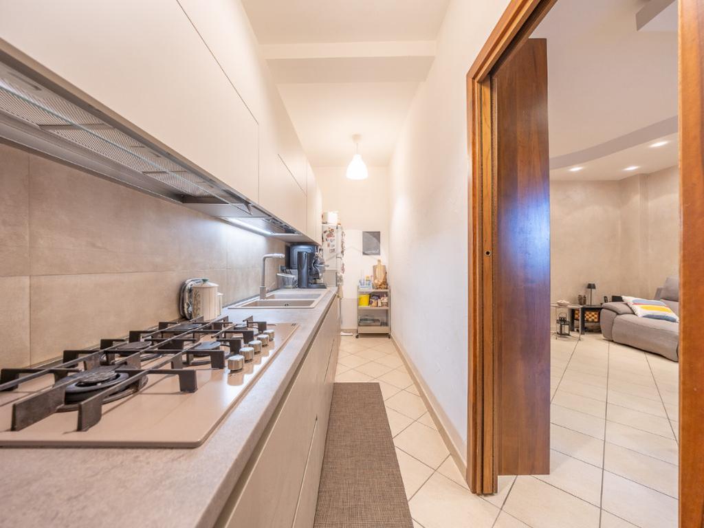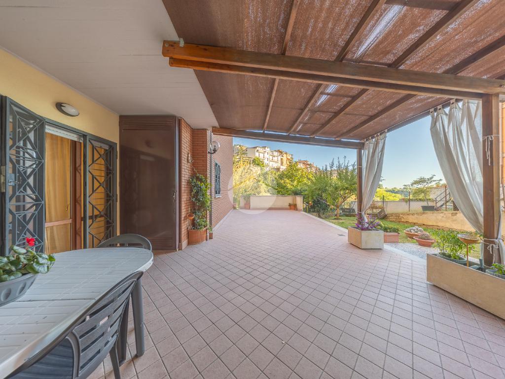 L'ingresso si apre su un luminoso soggiorno, dai toni raffinati, attraverso una porta finestra si accede direttamente al terrazzo di circa 100mq completo di giardino, Adiacente alla zona giorno troviamo una cucina con porta a scrigno, illuminata da una graziosa finestra.