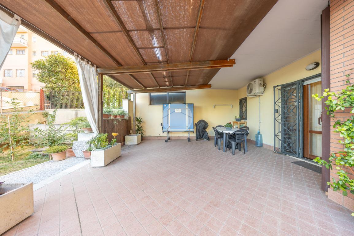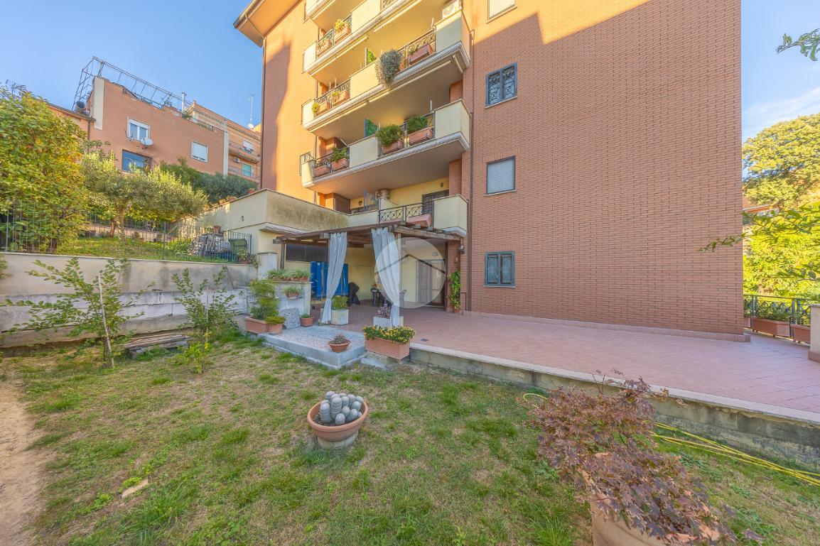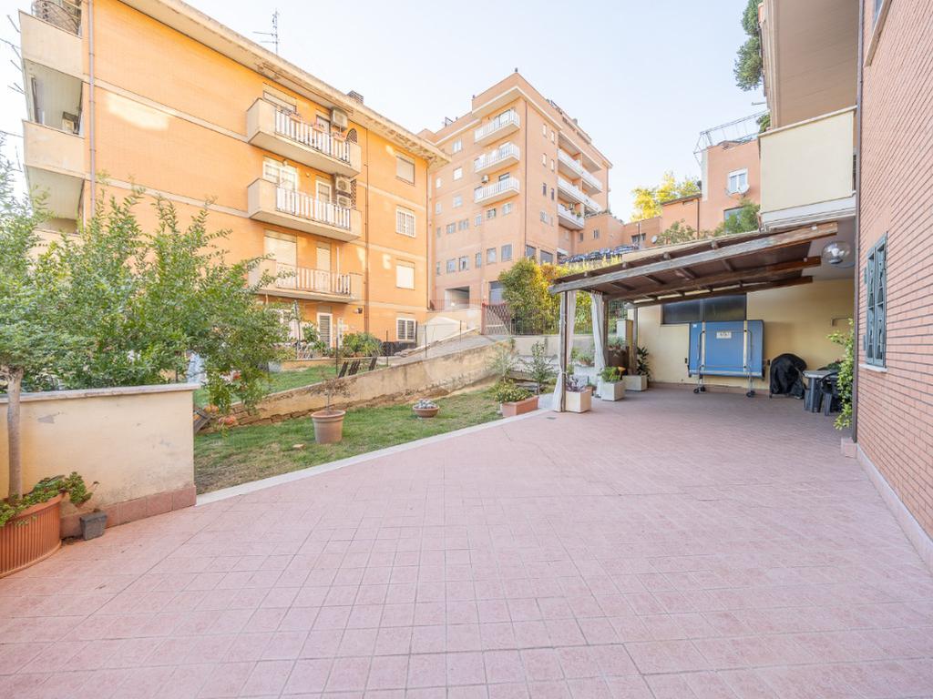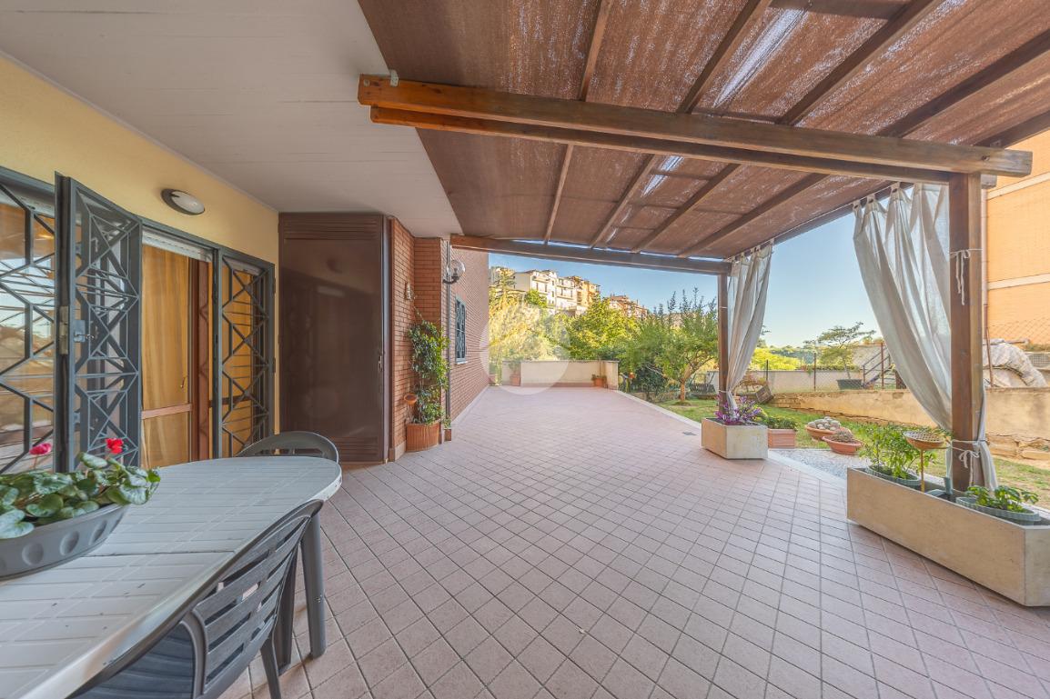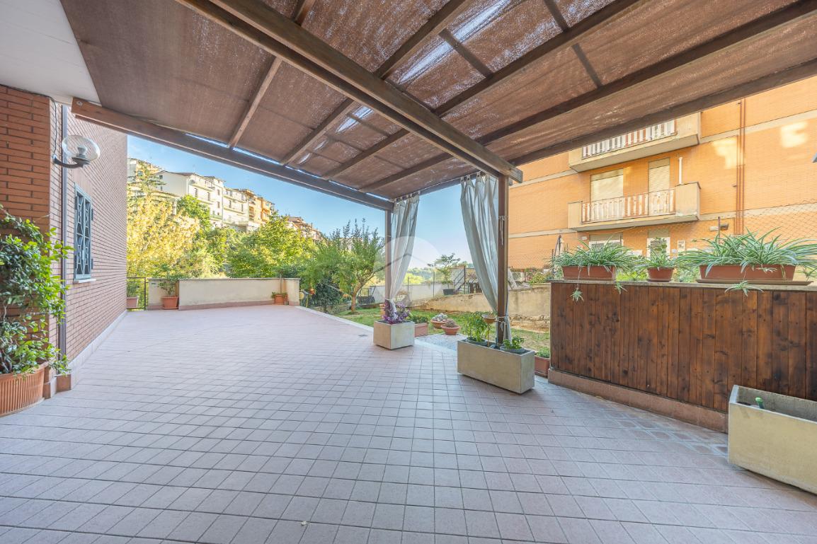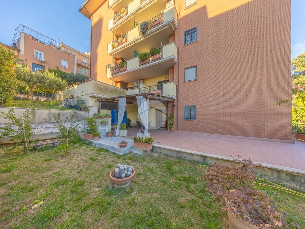 L'ingresso si apre su un luminoso soggiorno, dai toni raffinati, attraverso una porta finestra si accede direttamente al terrazzo di circa 100mq completo di giardino, Adiacente alla zona giorno troviamo una cucina con porta a scrigno, illuminata da una graziosa finestra.