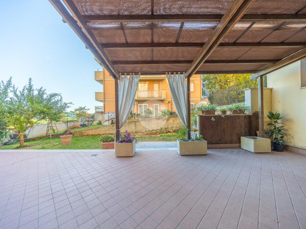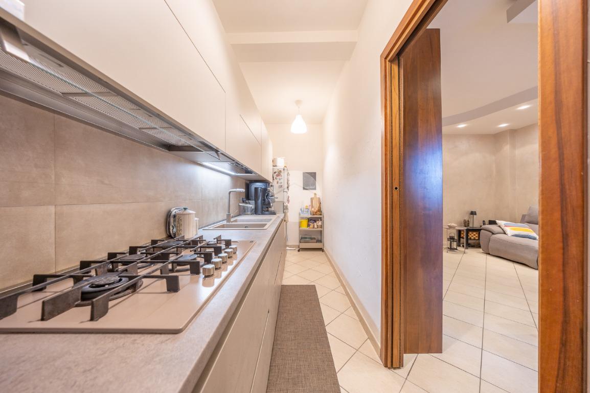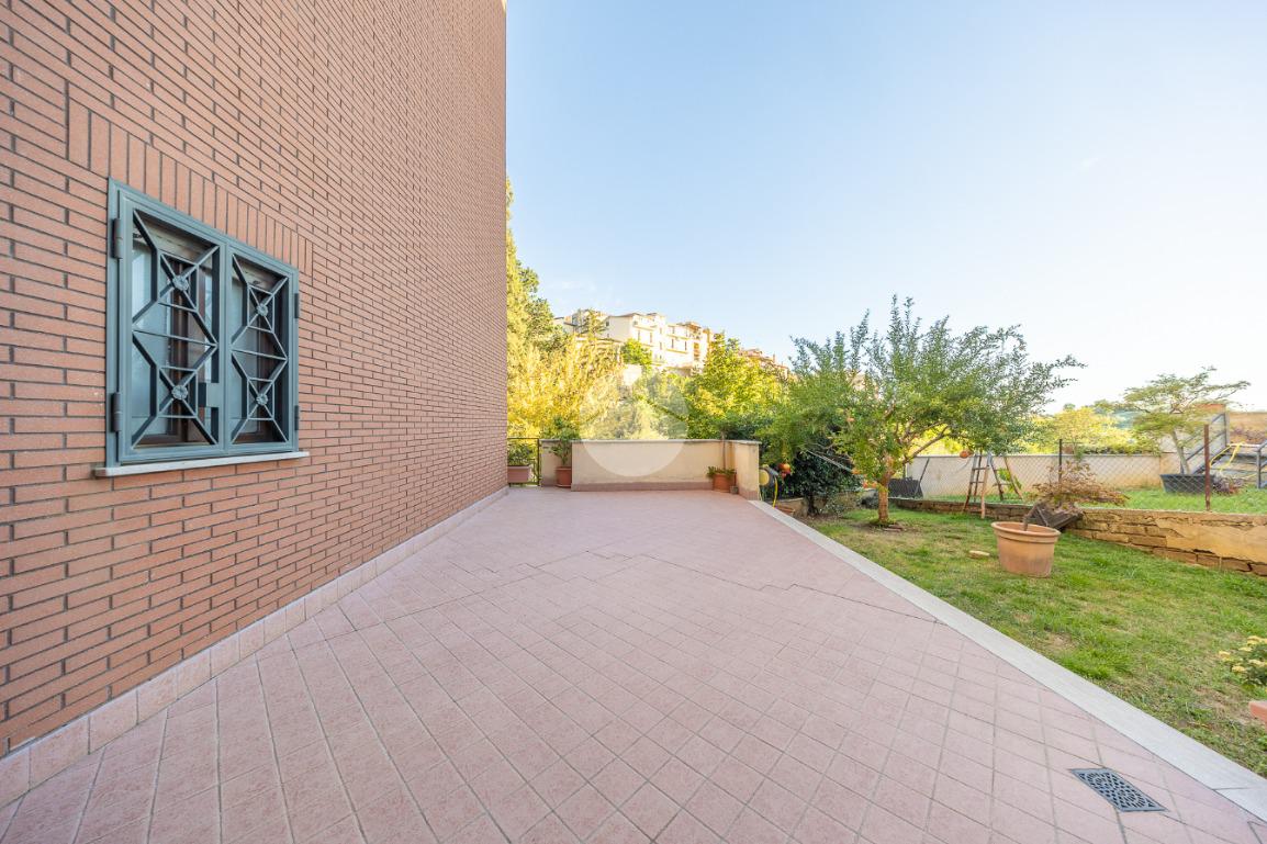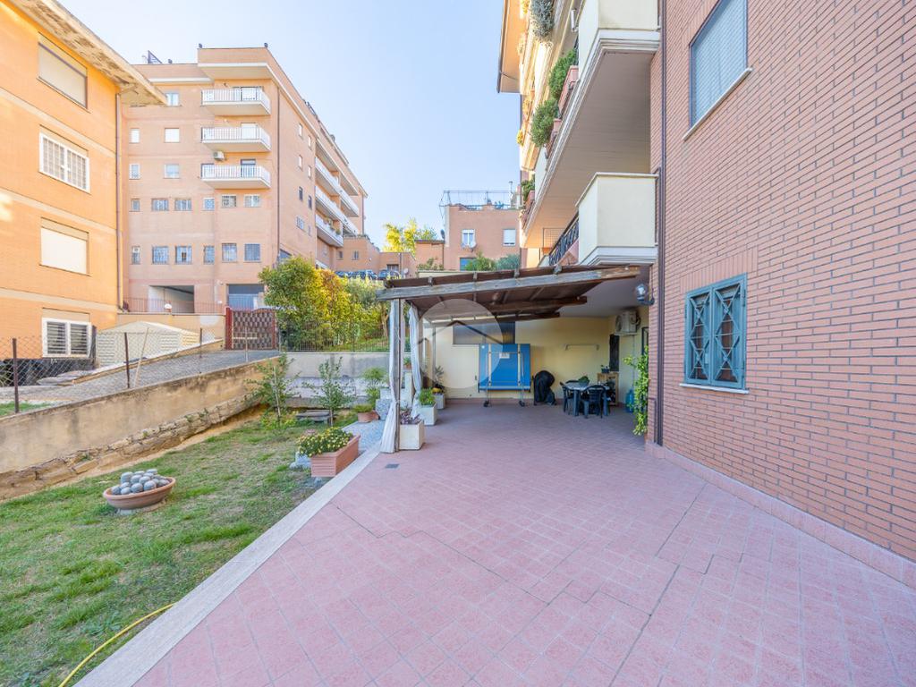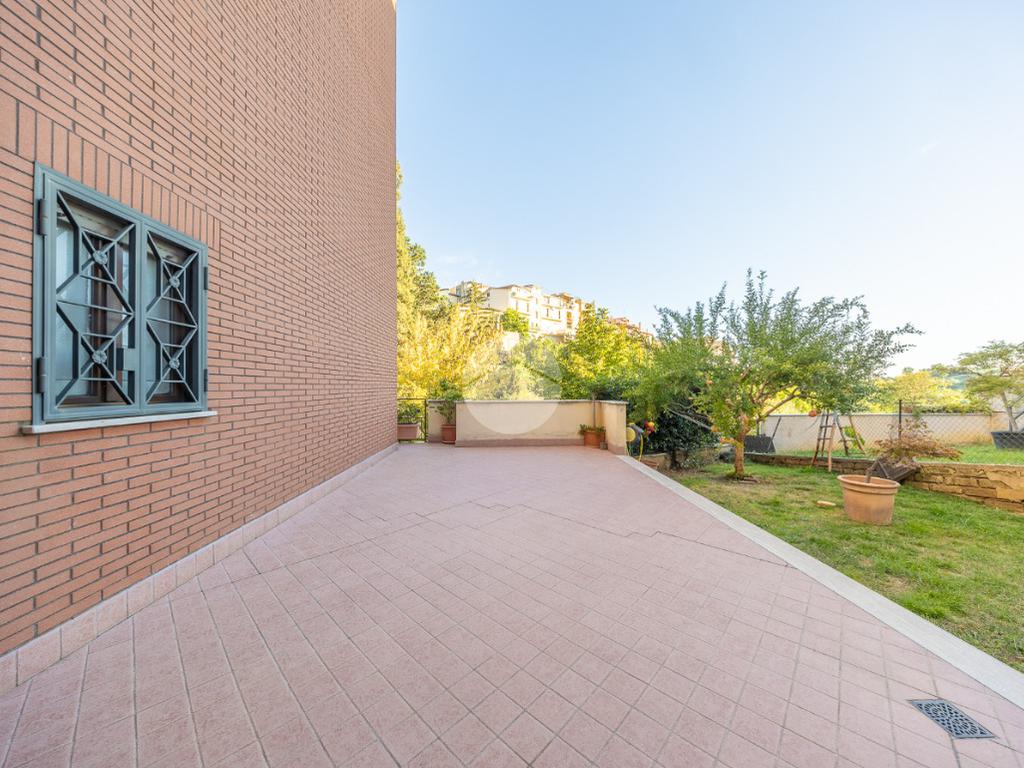 L'ingresso si apre su un luminoso soggiorno, dai toni raffinati, attraverso una porta finestra si accede direttamente al terrazzo di circa 100mq completo di giardino, Adiacente alla zona giorno troviamo una cucina con porta a scrigno, illuminata da una graziosa finestra.