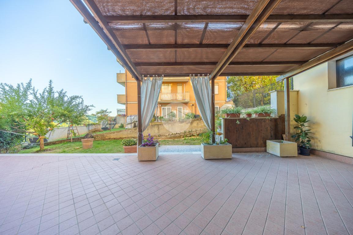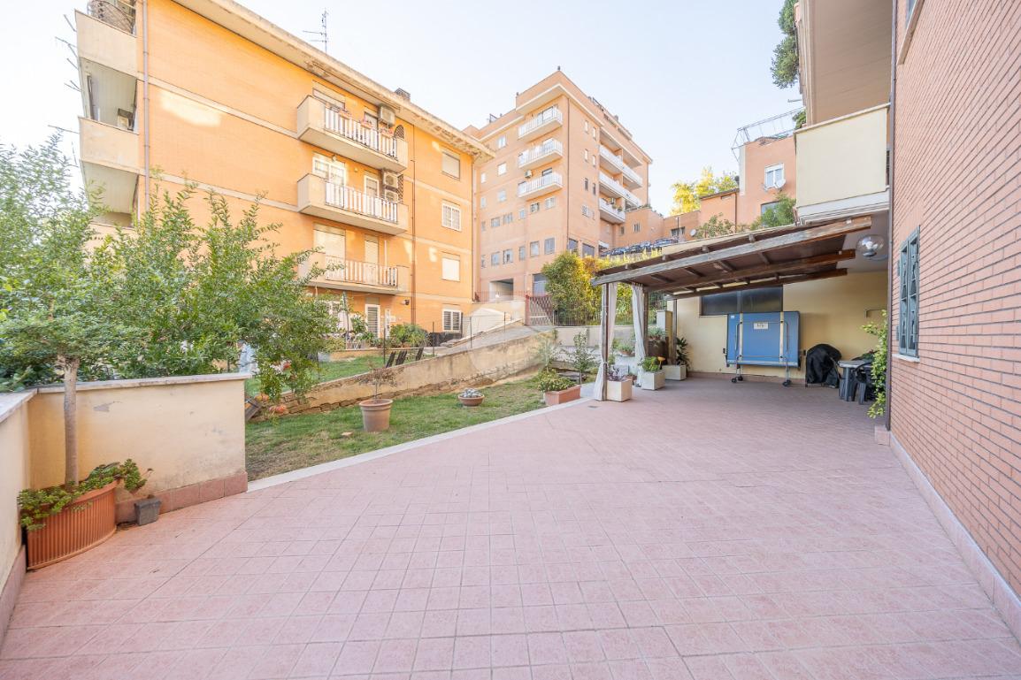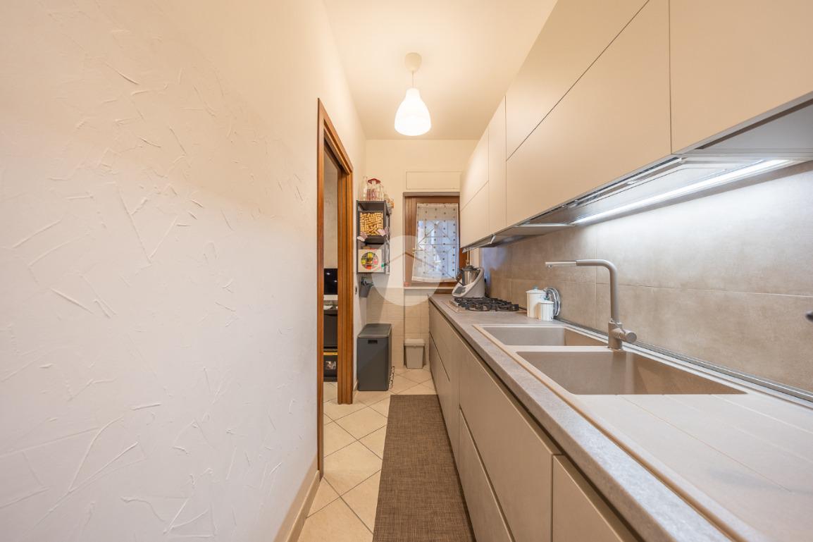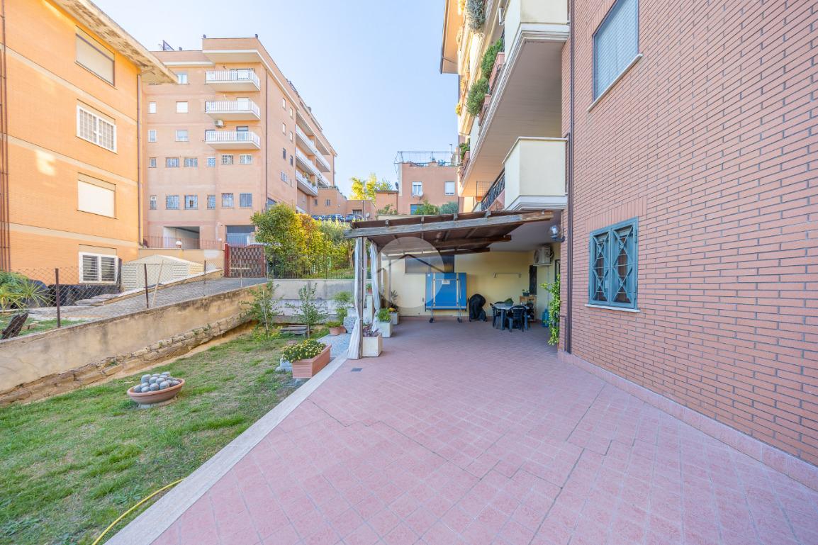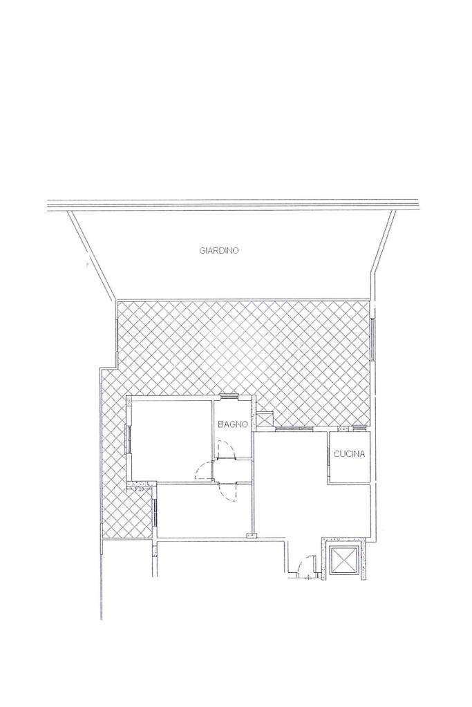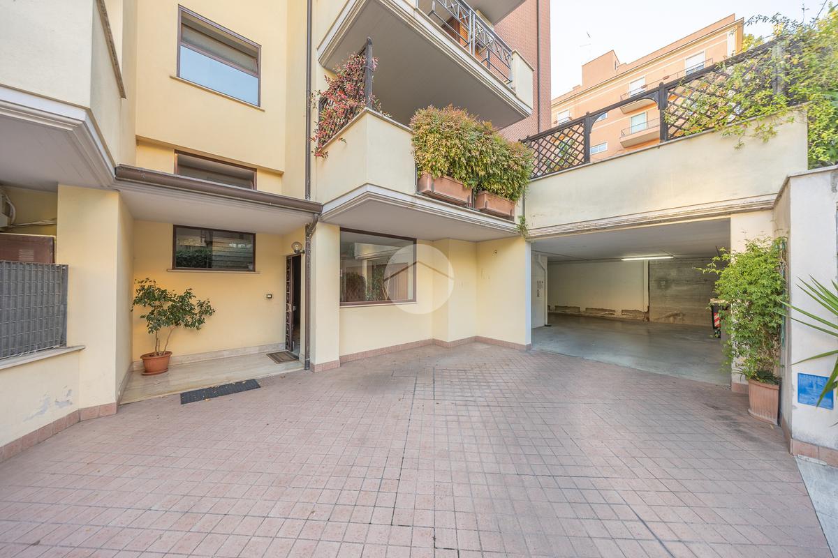 L'ingresso si apre su un luminoso soggiorno, dai toni raffinati, attraverso una porta finestra si accede direttamente al terrazzo di circa 100mq completo di giardino, Adiacente alla zona giorno troviamo una cucina con porta a scrigno, illuminata da una graziosa finestra.