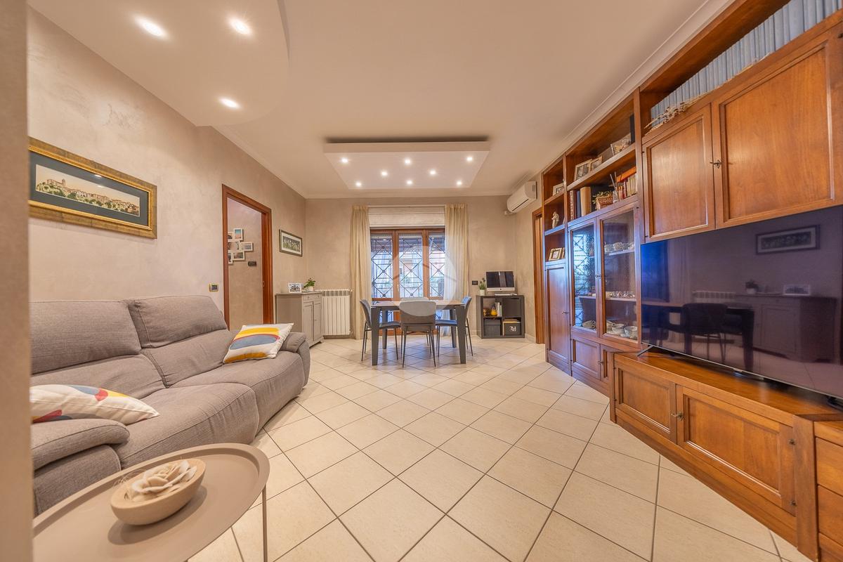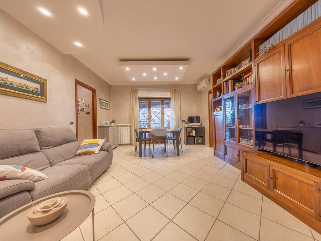 Nel cuore del centro cittadino di Monterotondo, pochi passi dai principali servizi, più precisamente, in Via Arno, proponiamo in vendita un elegante trilocale di circa 75 mq, situato al piano terra di una curata palazzina in cortina.