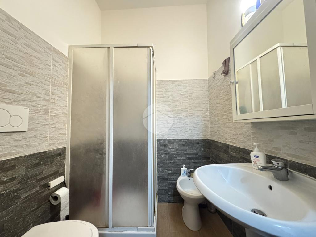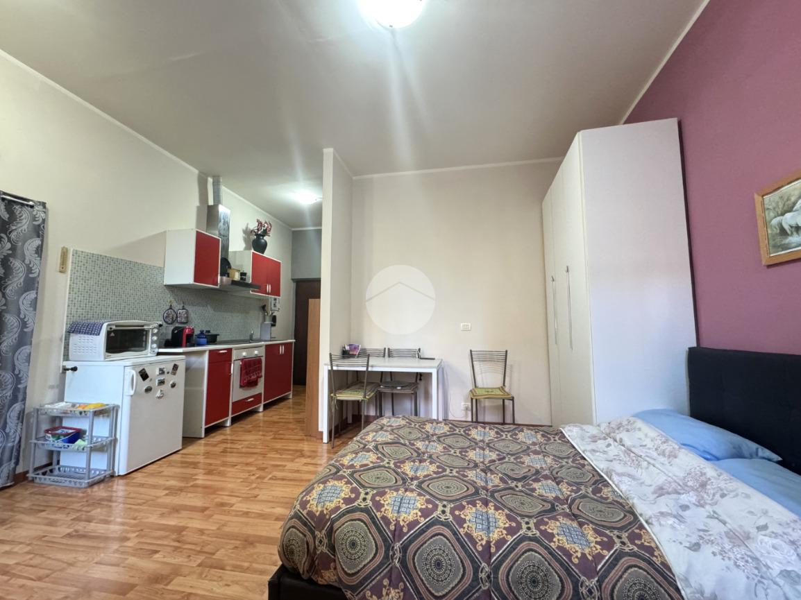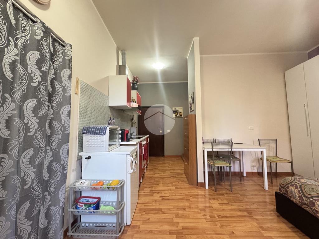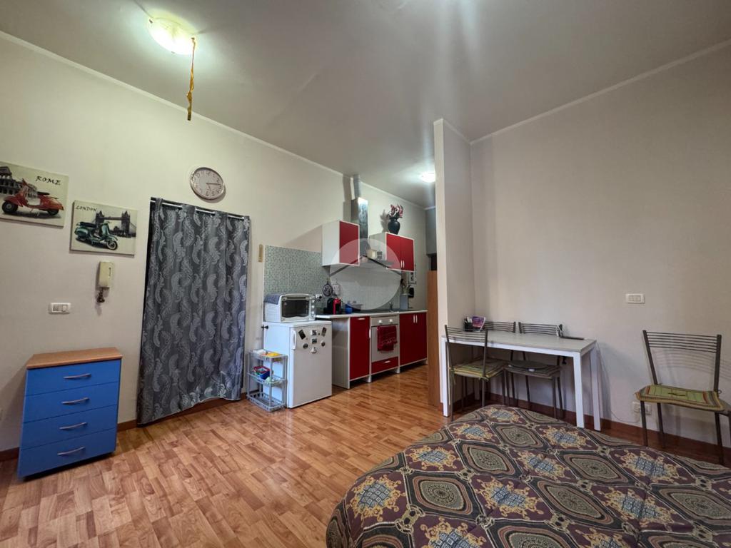 L’ingresso si apre su un ambiente unico ben organizzato, con zona living e cucina a vista, oltre a un bagno completo di box doccia.