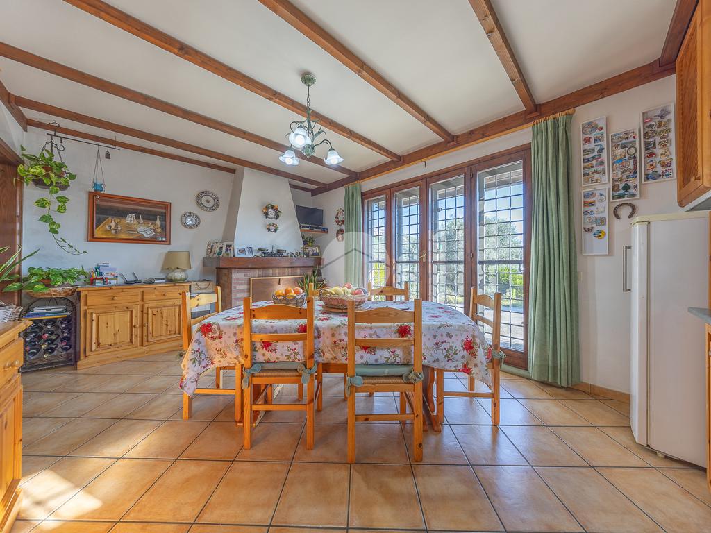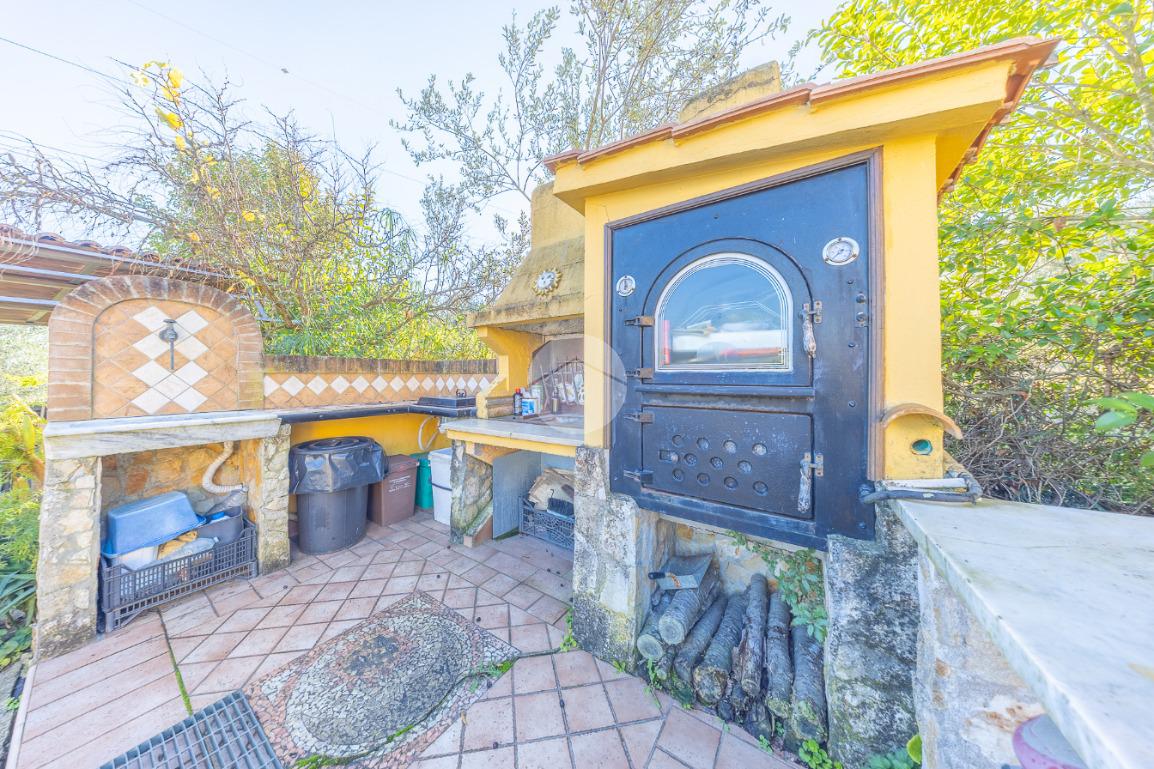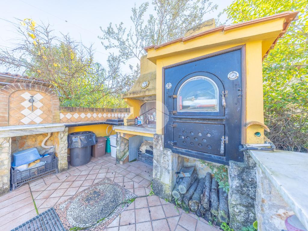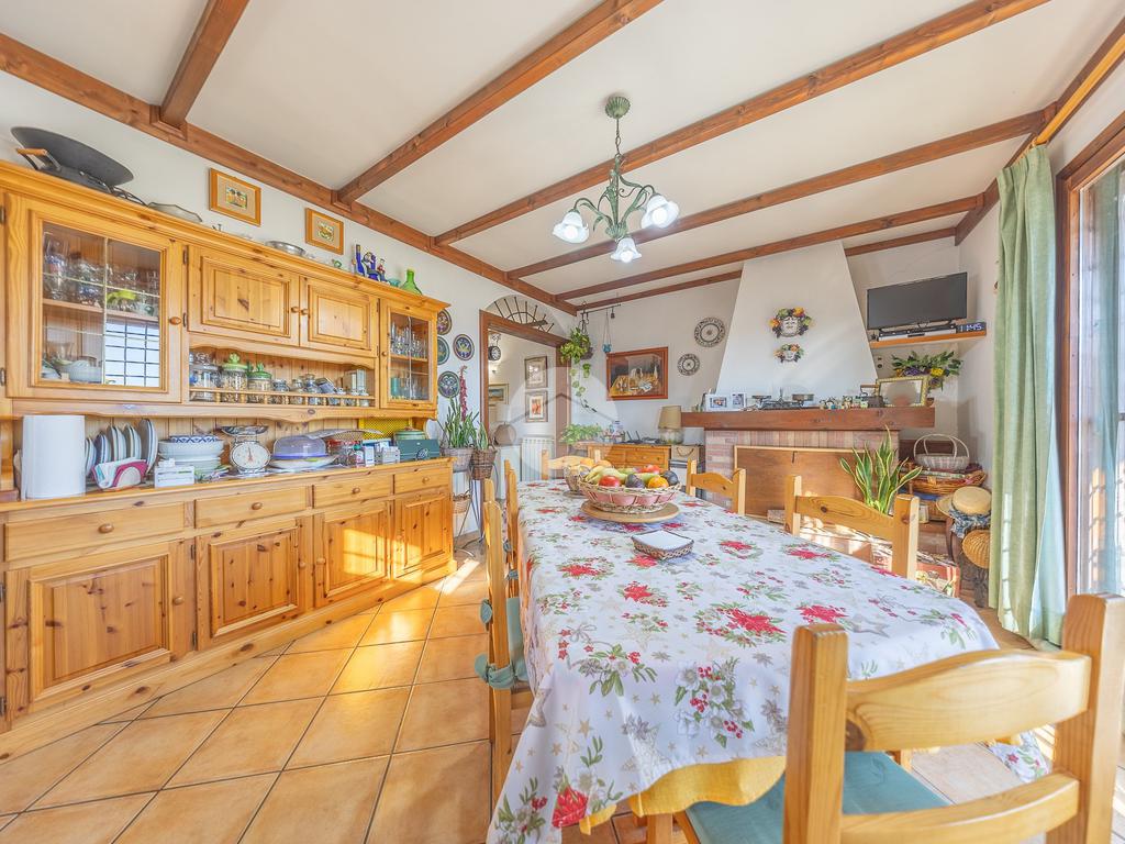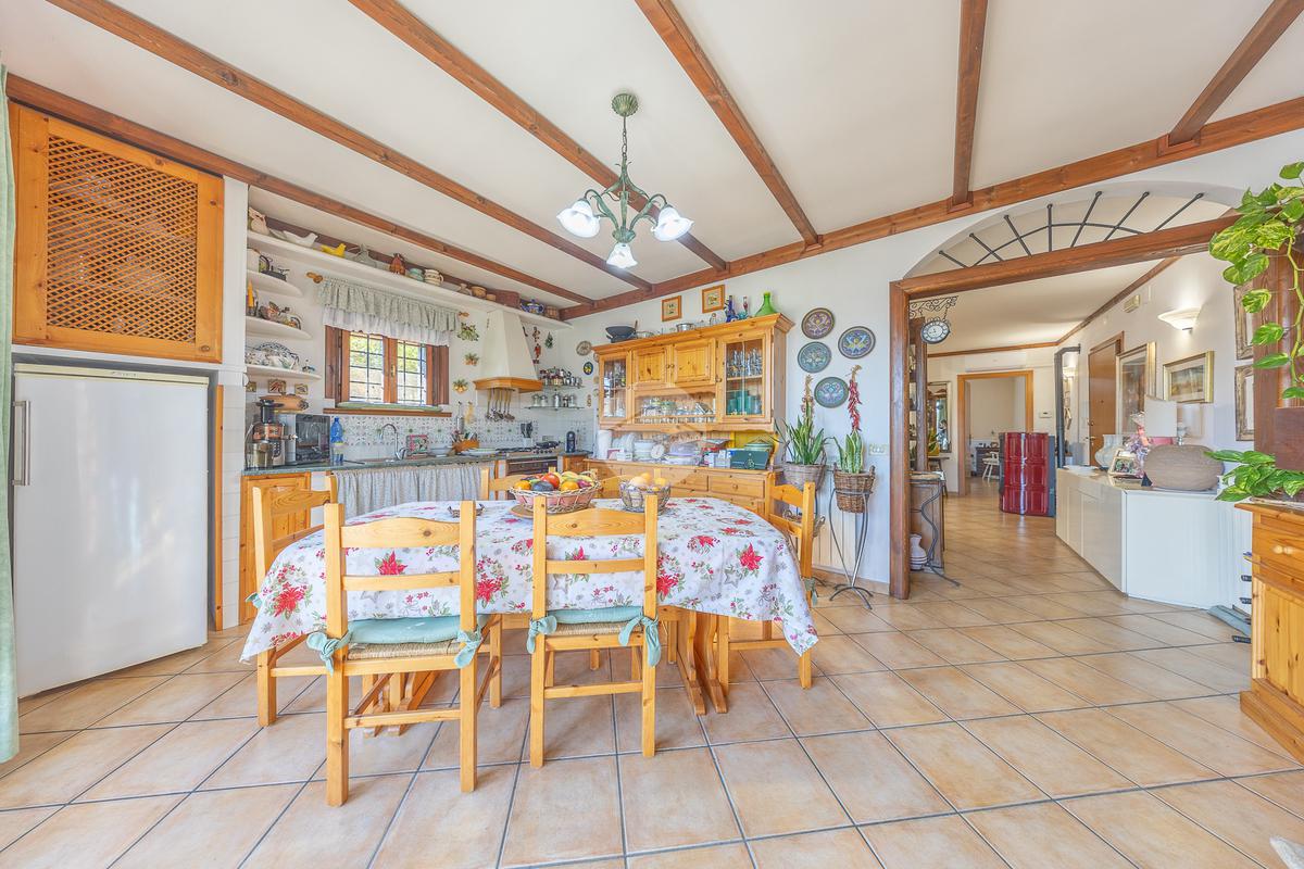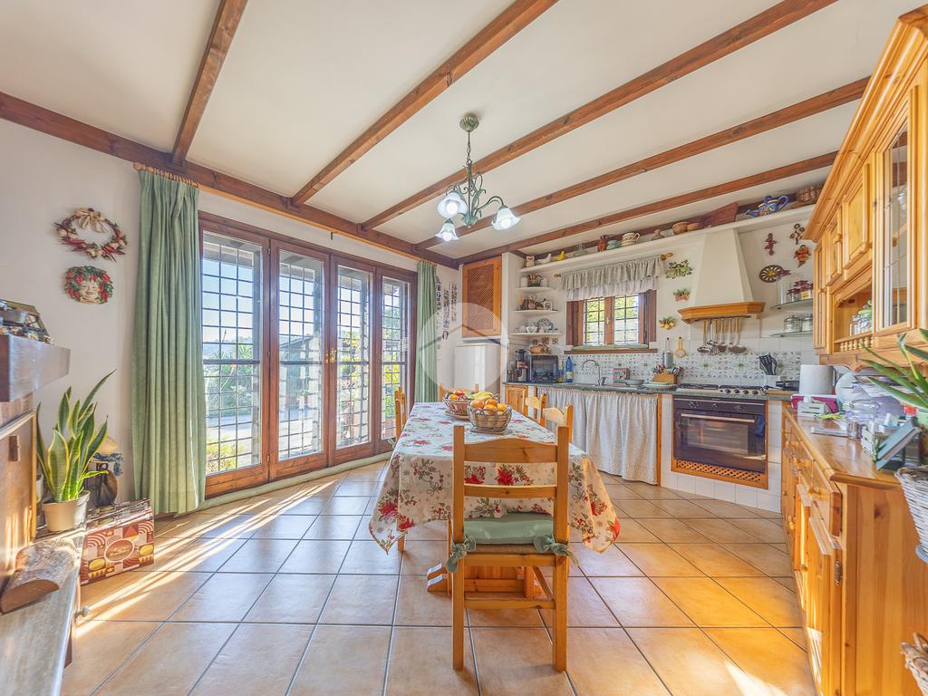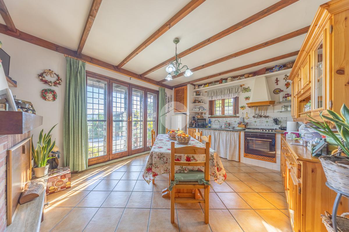 Un piccolo disimpegno del soggiorno conduce alla spaziosa cucina abitale, valorizzata da un suggestivo camino, grazie a una porta finestra, l’ambiente gode di un’ottima luminosità e di una vista mozzafiato sul verde circostante e ci permette di accedere direttamente alla corte esterna e all’ampio terreno di circa 2750 mq. Lo spazio all’aperto, è attrezzato con due forni a legna, un angolo barbecue, un cucinotto e un pratico gazebo ideale per momenti conviviali all’aria aperta.